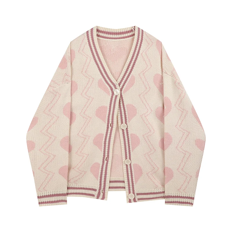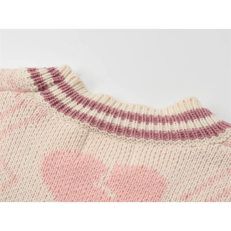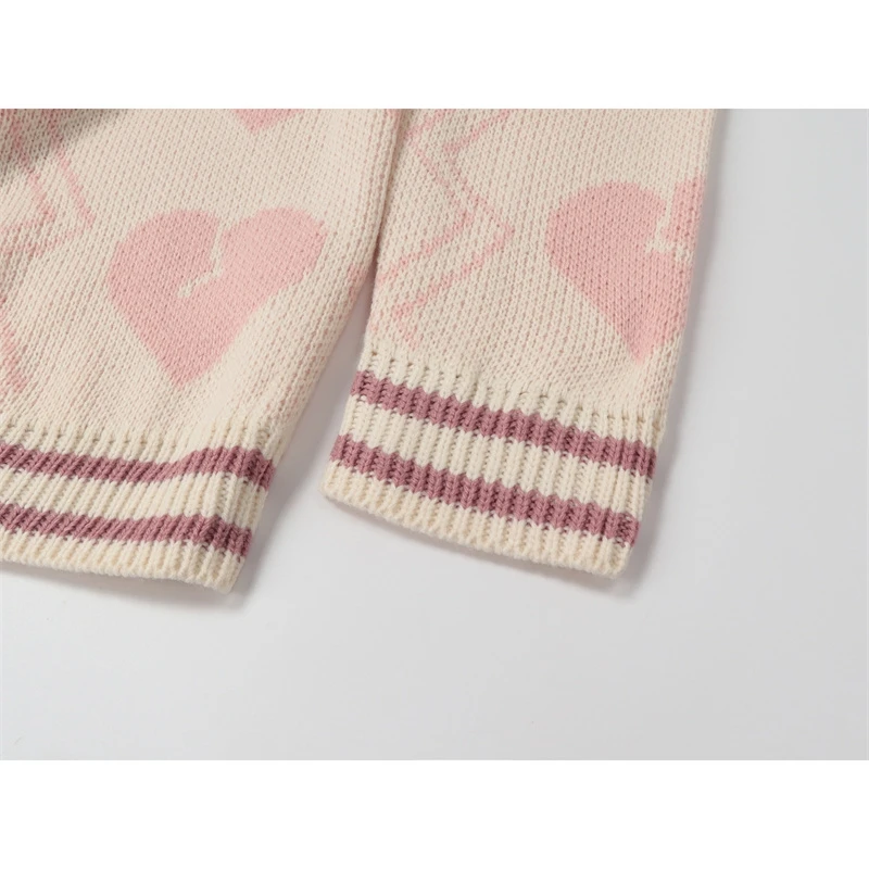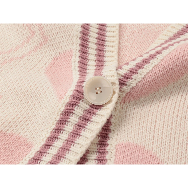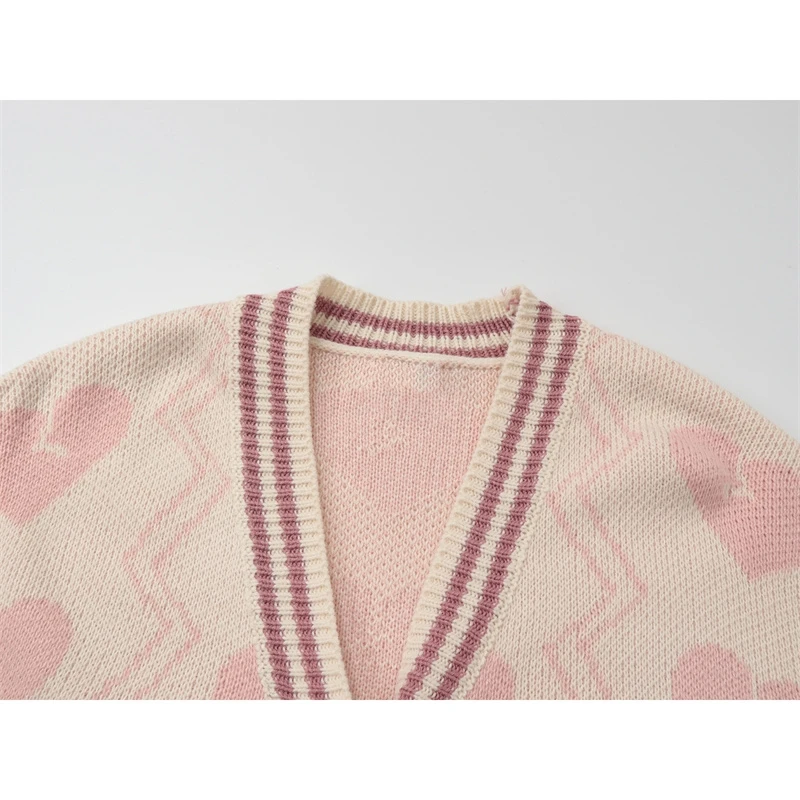 2022 Fashion Women Cardigan Sweater Long Sleeve V-neck Single Breasted Pink Sweet Heart-shaped Print Casual Loose Knitwear Coat