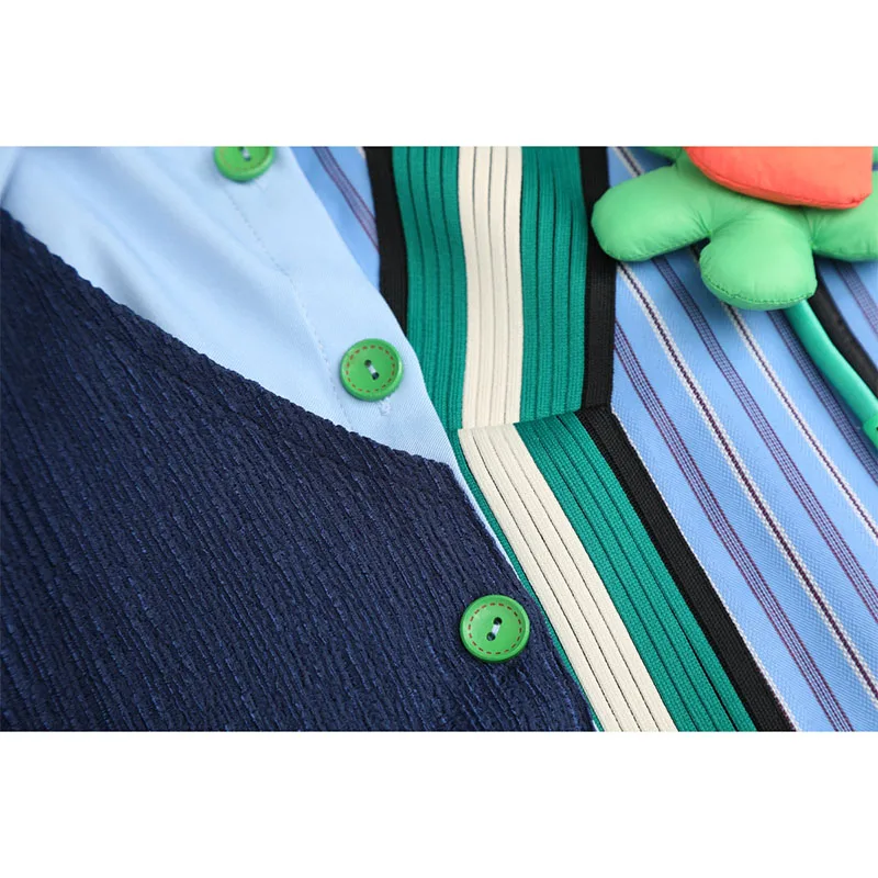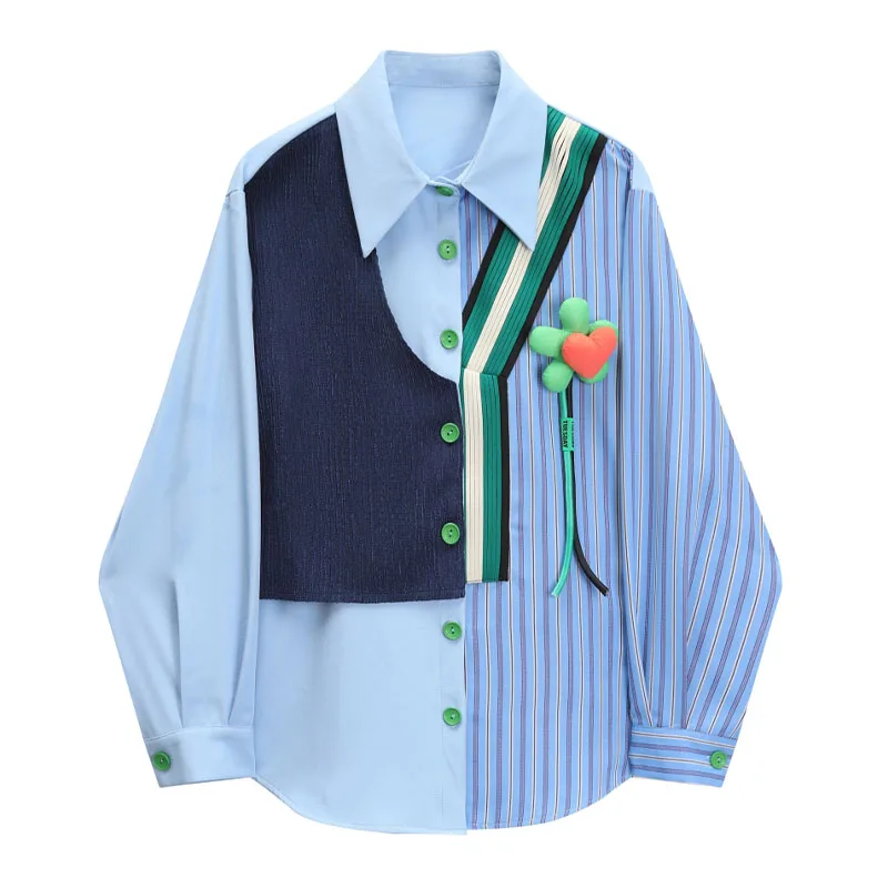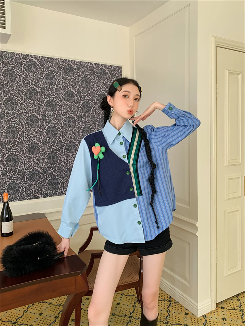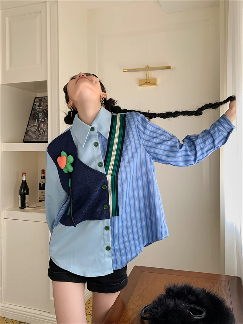 Elegant Women's Fake Two Pieces Striped Patchwork Shirt Chic Vintage Blouses Casual Lapel Collar Long Sleeve Loose Blouse Female
