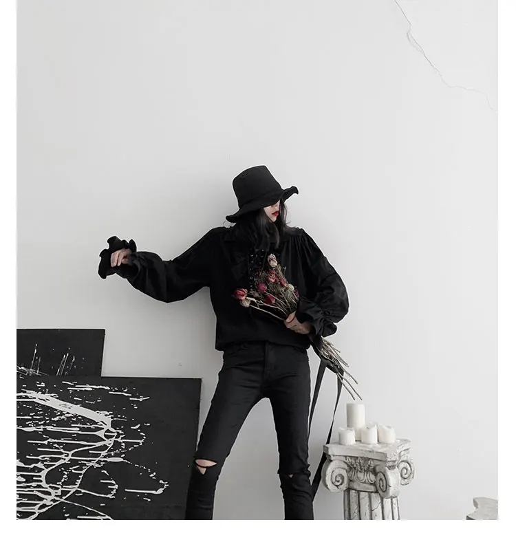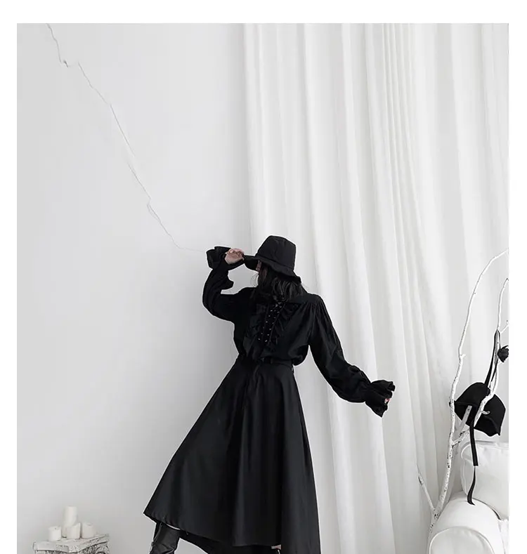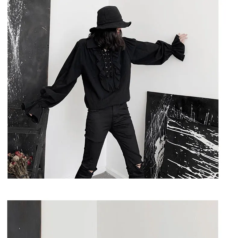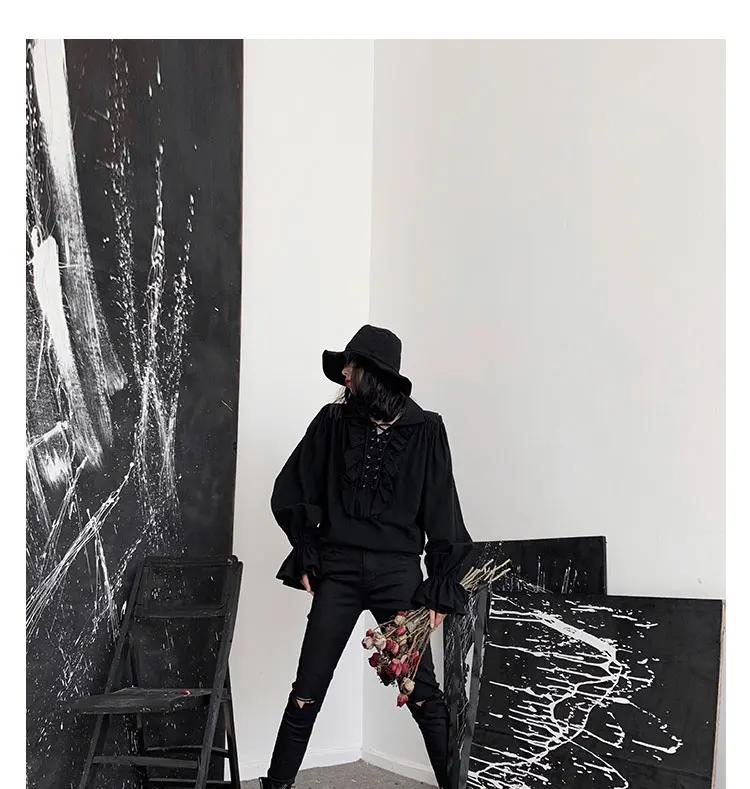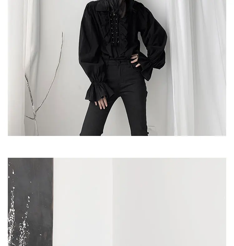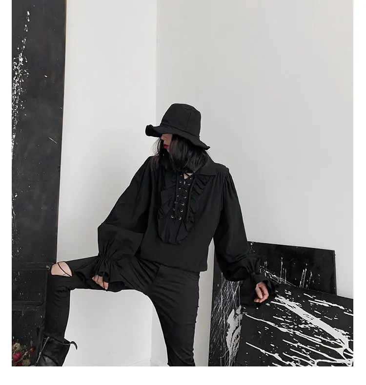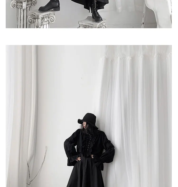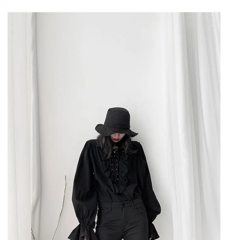 Fall Fashion Vintage Gothic Shirt Women Flare Sleeves Ruffles Oversize Club Party Evening Girl Lolita Black Blouse V-neck Tops