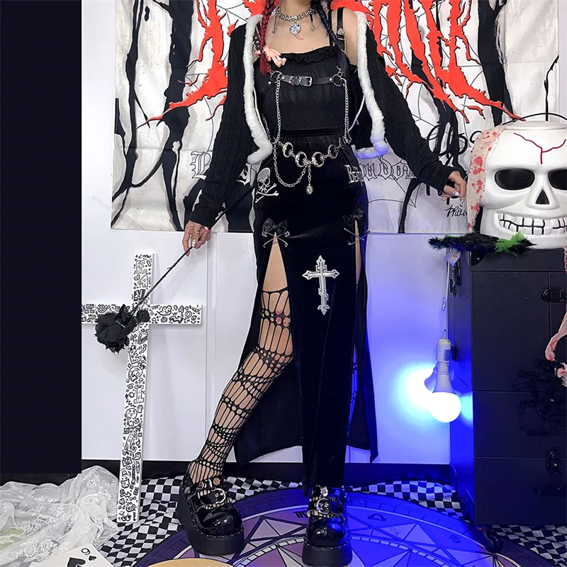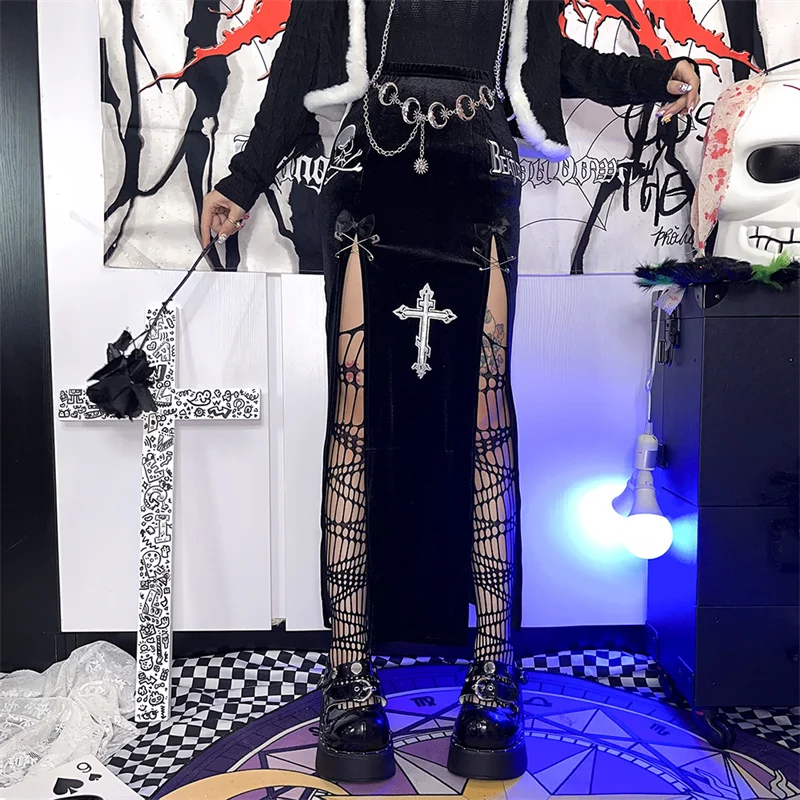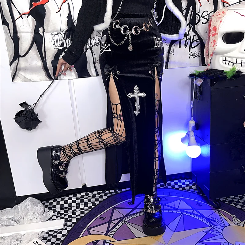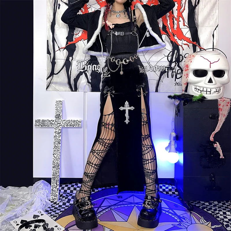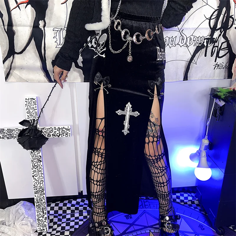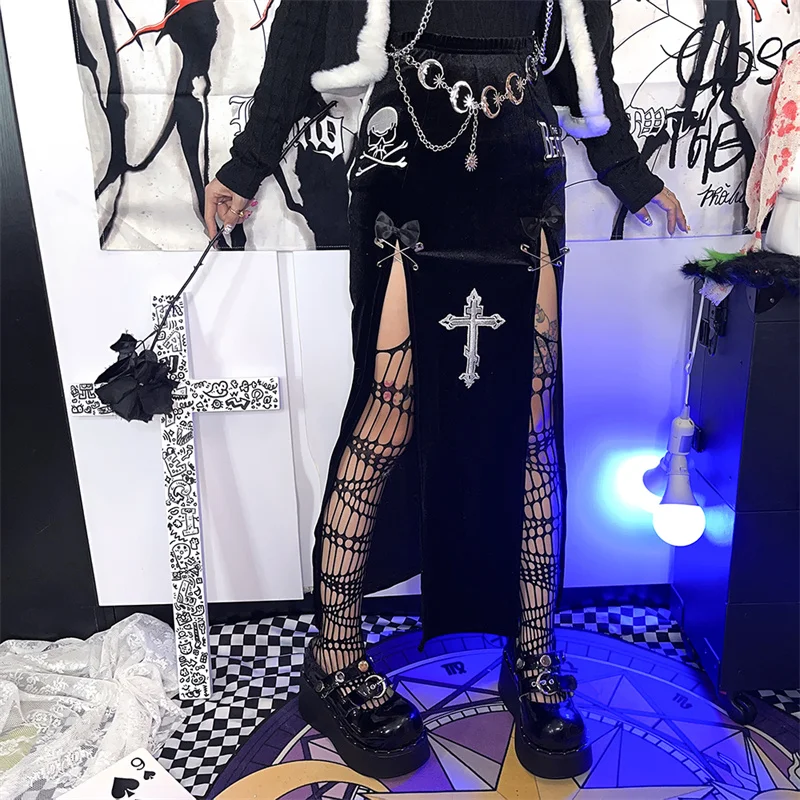 Goth Vintage Black High Split Skirts Aesthetic Sexy High Waist Bow Bodycon Long Skirt Elegant E Girl Punk Partywear Clothes Y2k