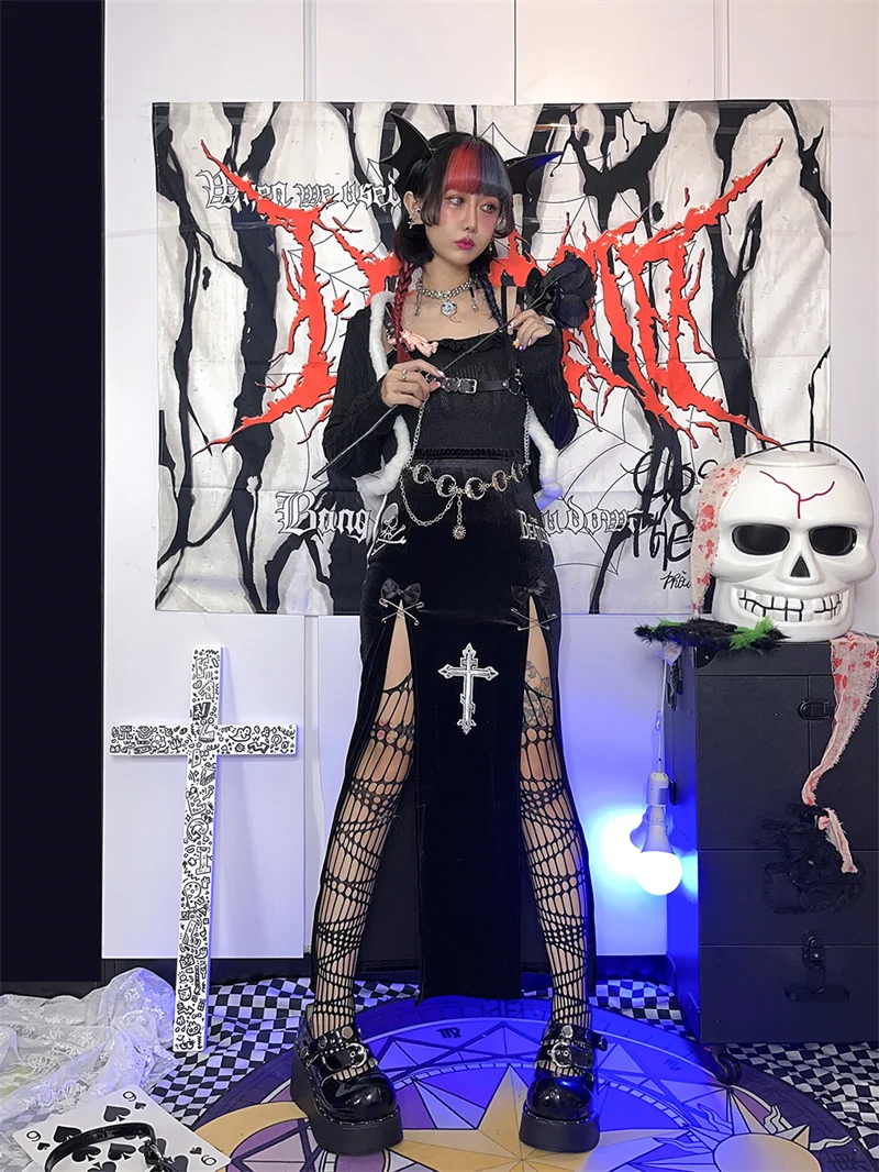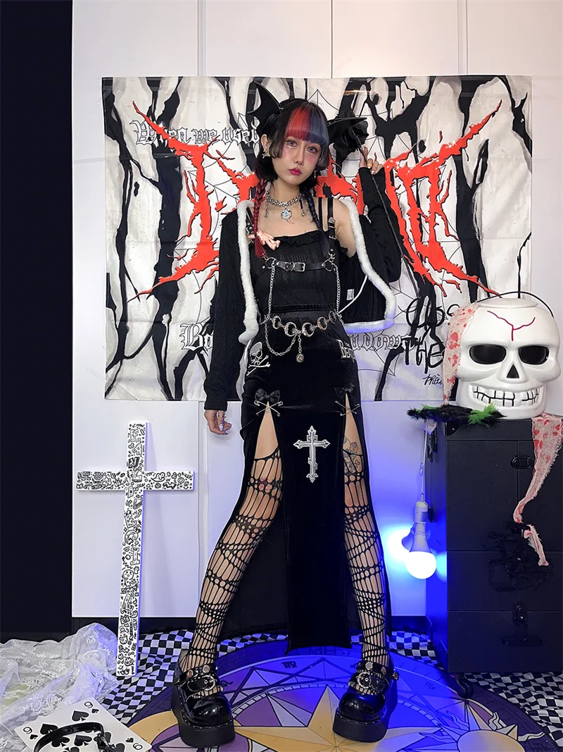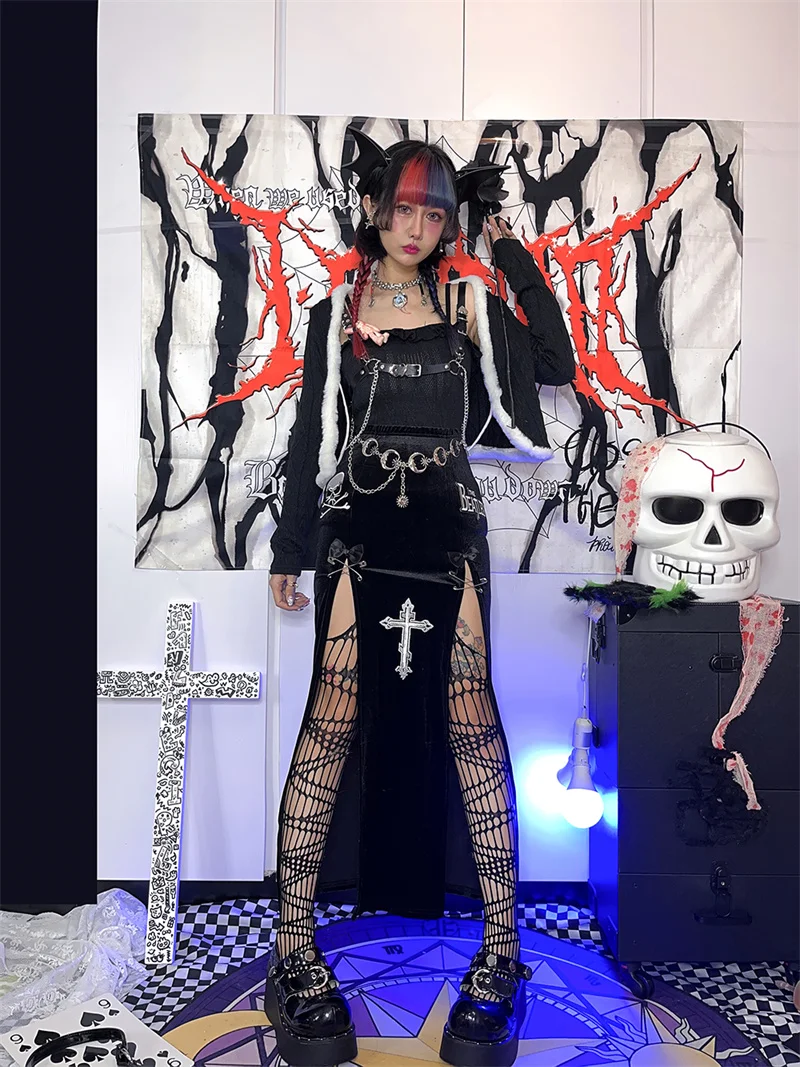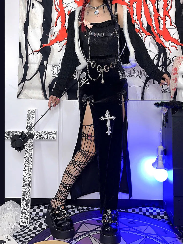 Goth Vintage Black High Split Skirts Aesthetic Sexy High Waist Bow Bodycon Long Skirt Elegant E Girl Punk Partywear Clothes Y2k