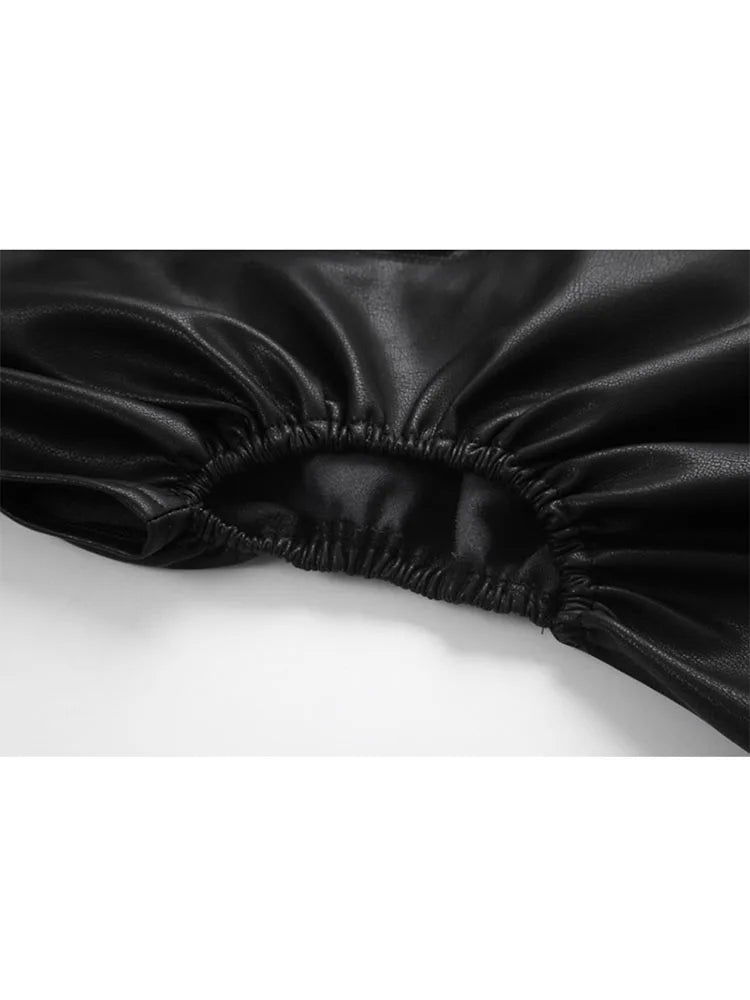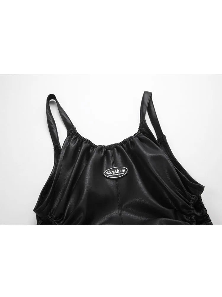 Pu Faux Leather Sexy Black Spaghetti Strap Mini Dresses Women High Waist Hollow Out Design Backless Loose Party Club Midi Frocks