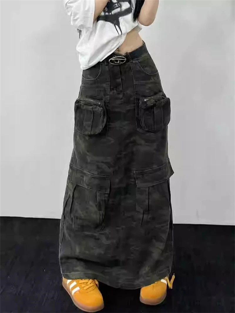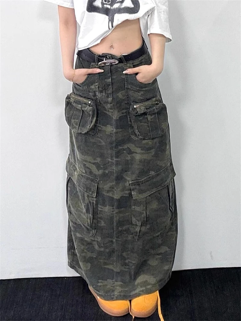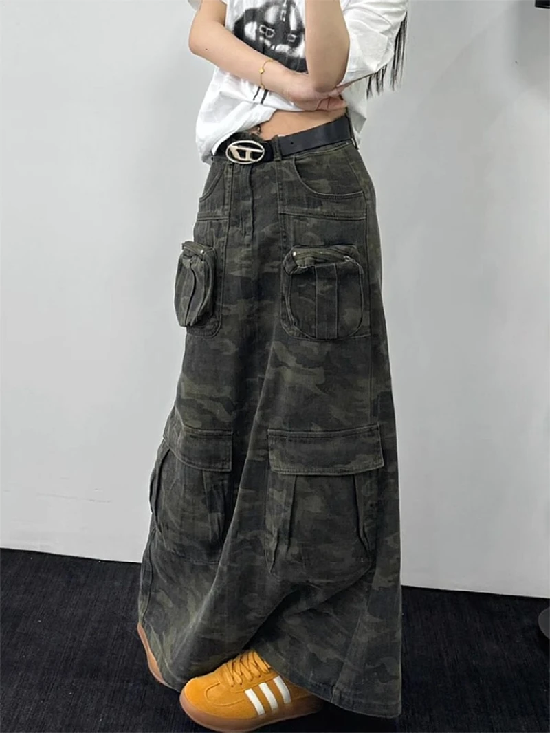 Women A-line Camouflage Skirt Vintage 90s Aesthetic Y2k Long Cargo Skirt Harajuku Korean Skirts 2000s Trashy Emo Clothes Summer