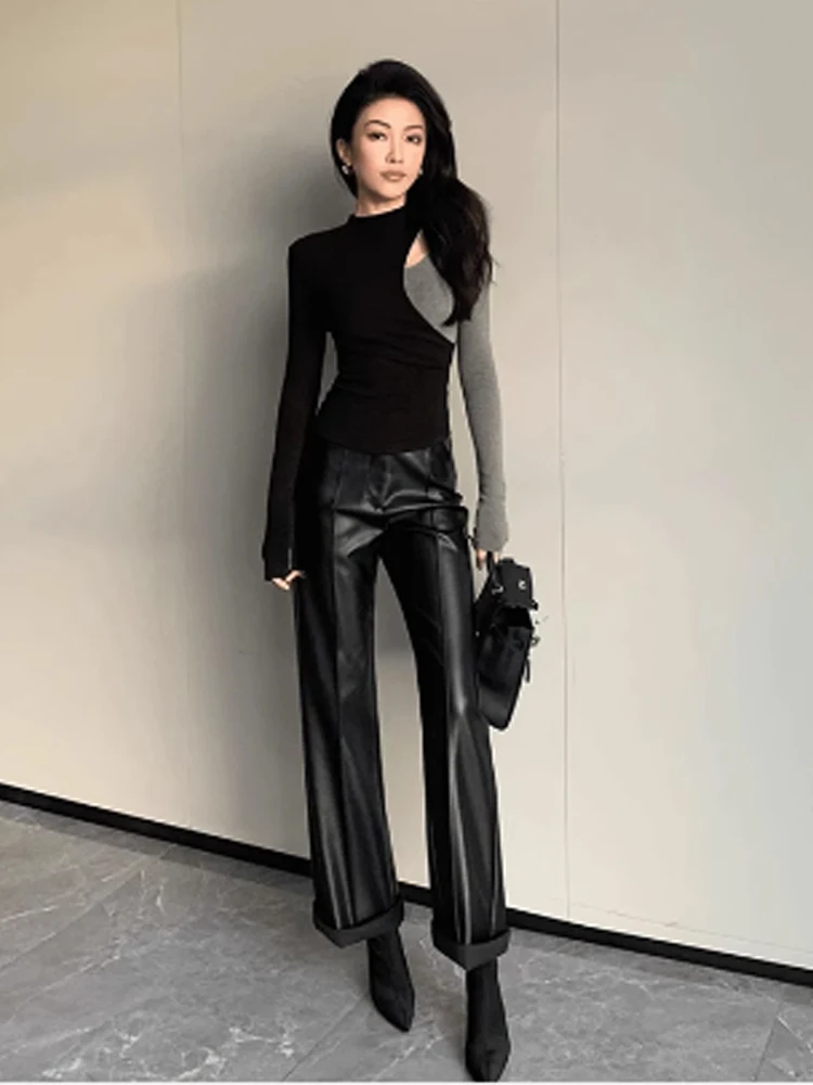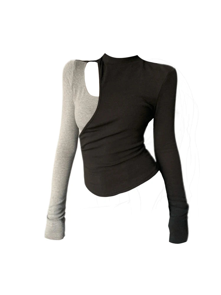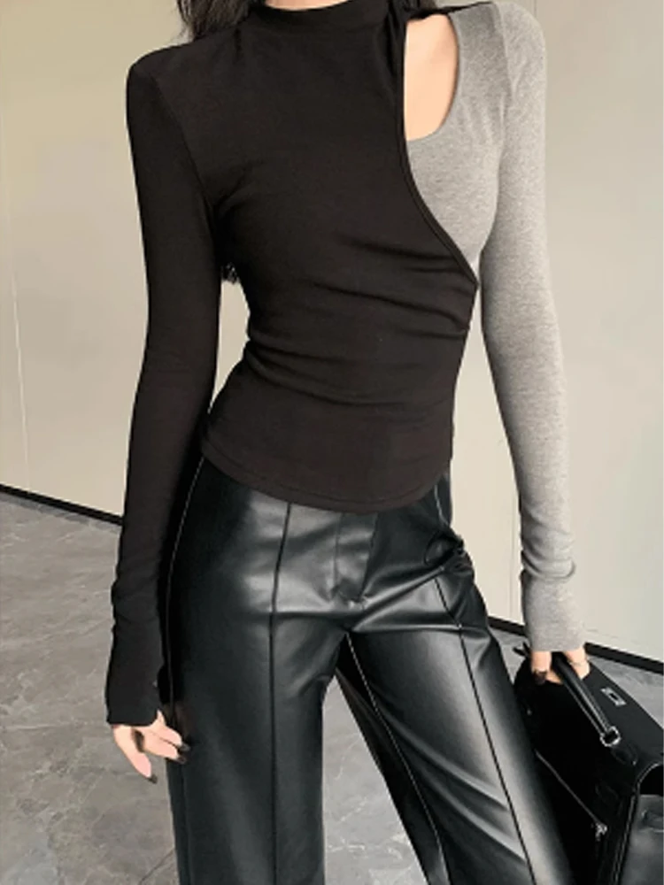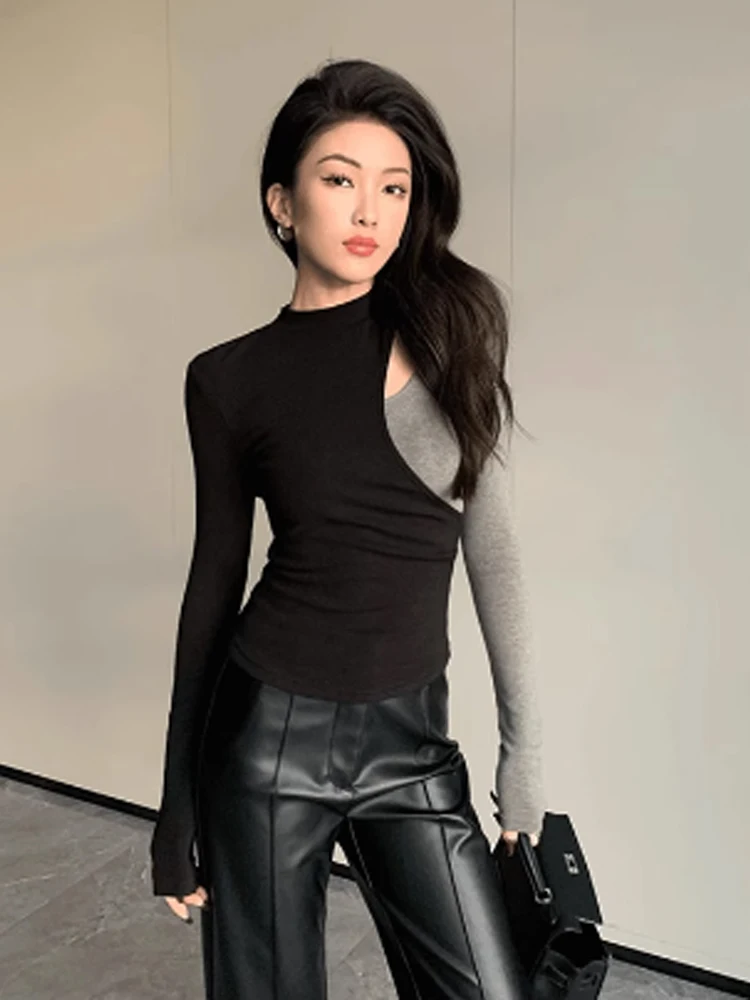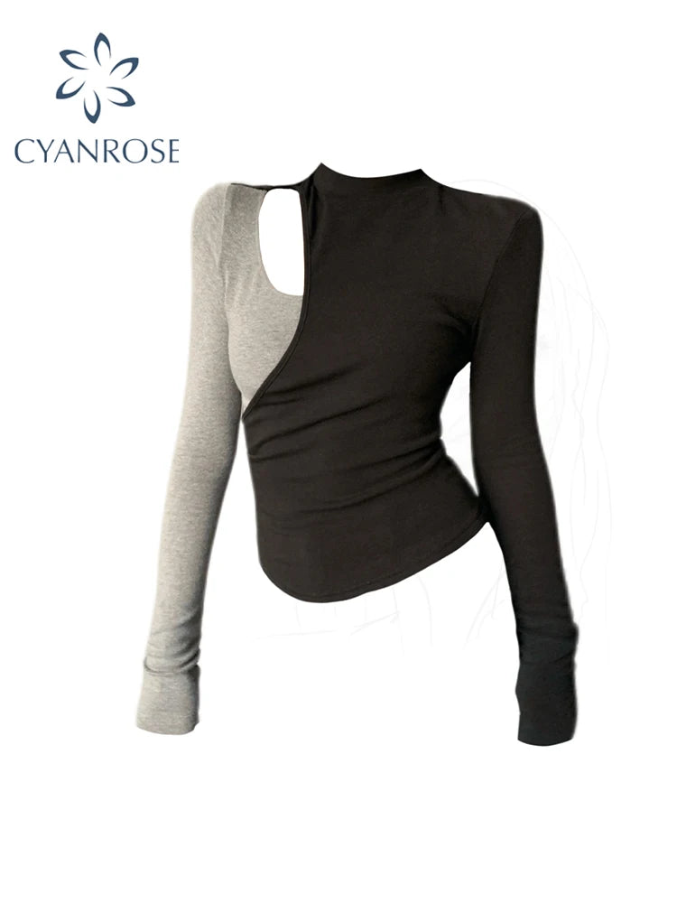Women Black Grey Patchwork T-shirt Harajuku Korean Y2k Vintage 90s Tee Tops Long Sleeve Slim T-shirts 2000s Emo Coquette Clothes