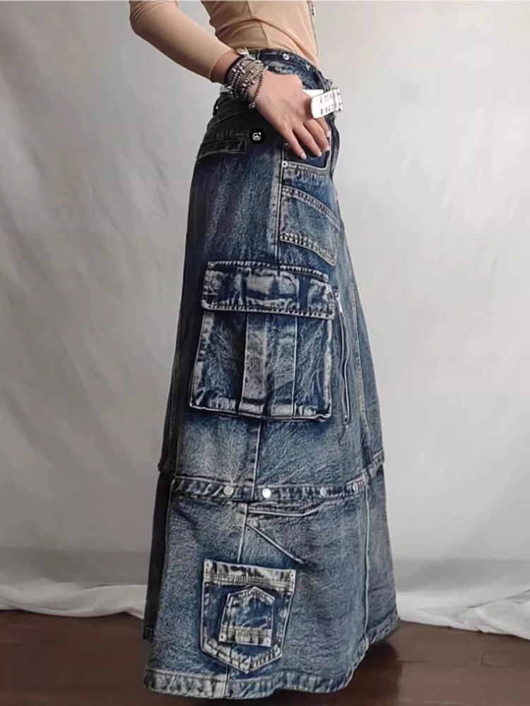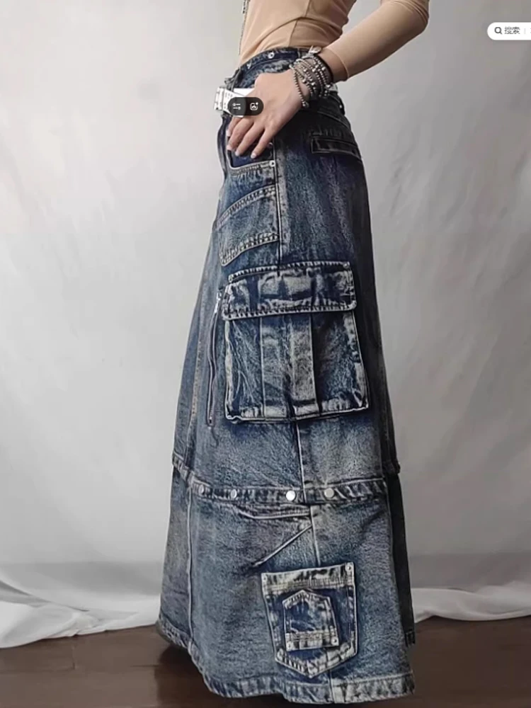 Women Blue A-line Denim Cargo Skirt Y2k Long Cowboy Skirts 90s Aesthetic Harajuku Korean Emo Jeans Skirt 2000s Vintage Clothes