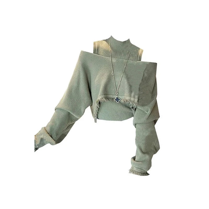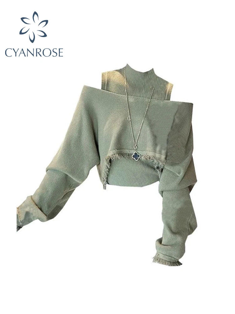 Women Green Pullover Knitted Sweater Harajuku Y2k Long Sleeves O-Neck Sweater Jumper Vintage 2000s 90s Aesthetic Clothes Autumn