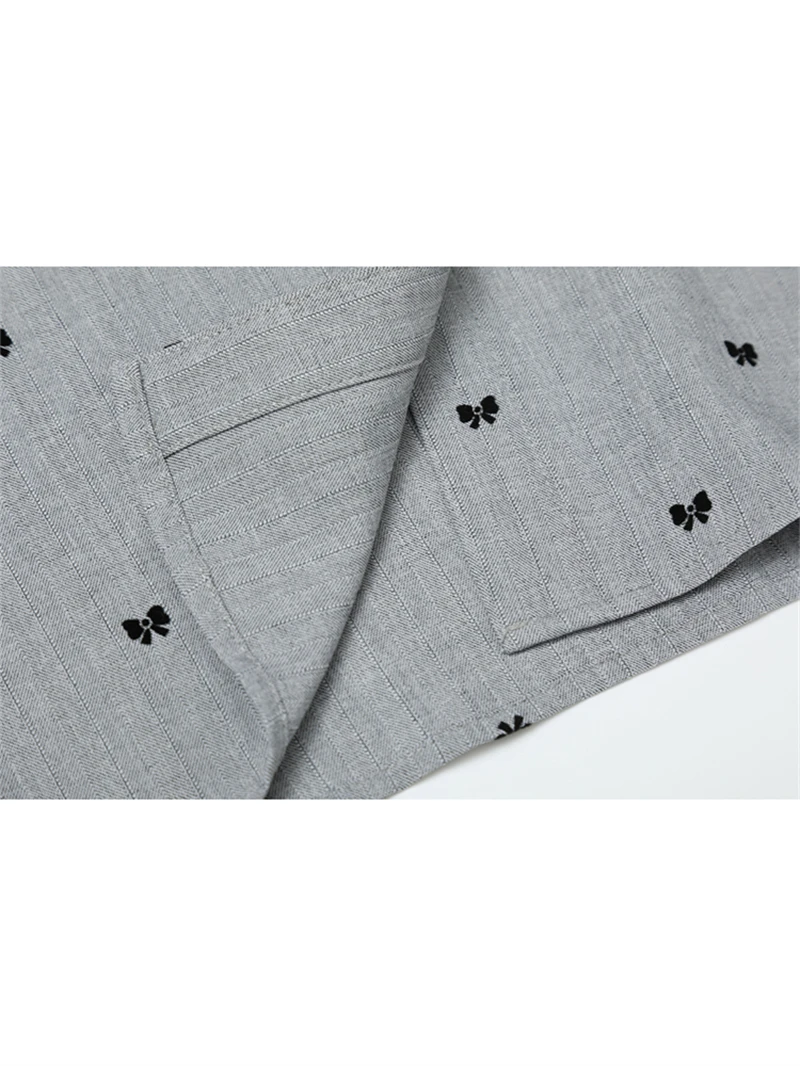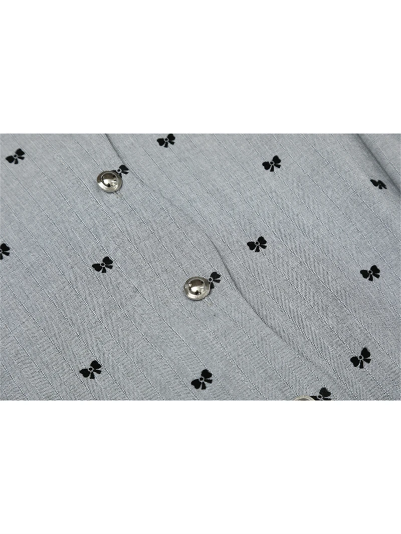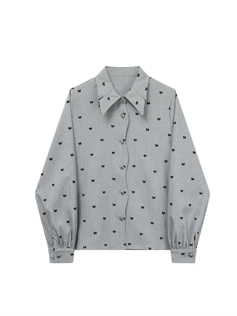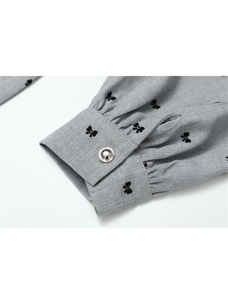 Women Grey Bow Print Shirts and Blouses Y2k 90s Vintage Korean Harajuku 2000s Elegant Long Sleeve Polo-Neck Shirt Trashy Clothes