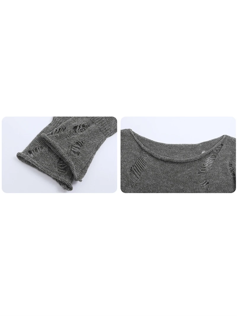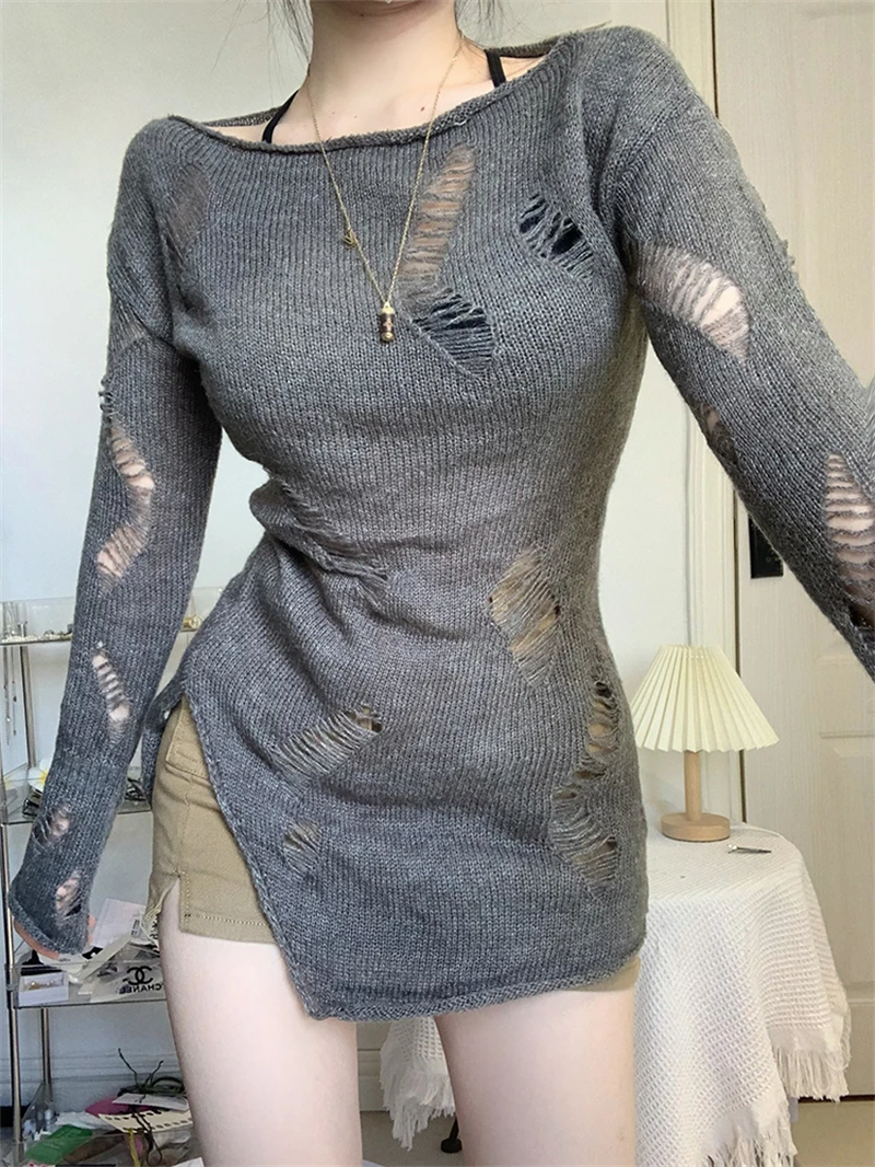 Women Grey Torn T-shirt Harajuku Korean Y2k Tees Top Vintage 90s Aesthetic Long Sleeve T-shirt 2000s Trashy Fashion Clothes 2024