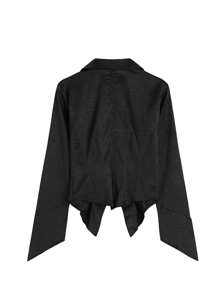 Women's Jacquard Blouse - Black Notched Collar Loose Tunic Office Elegant