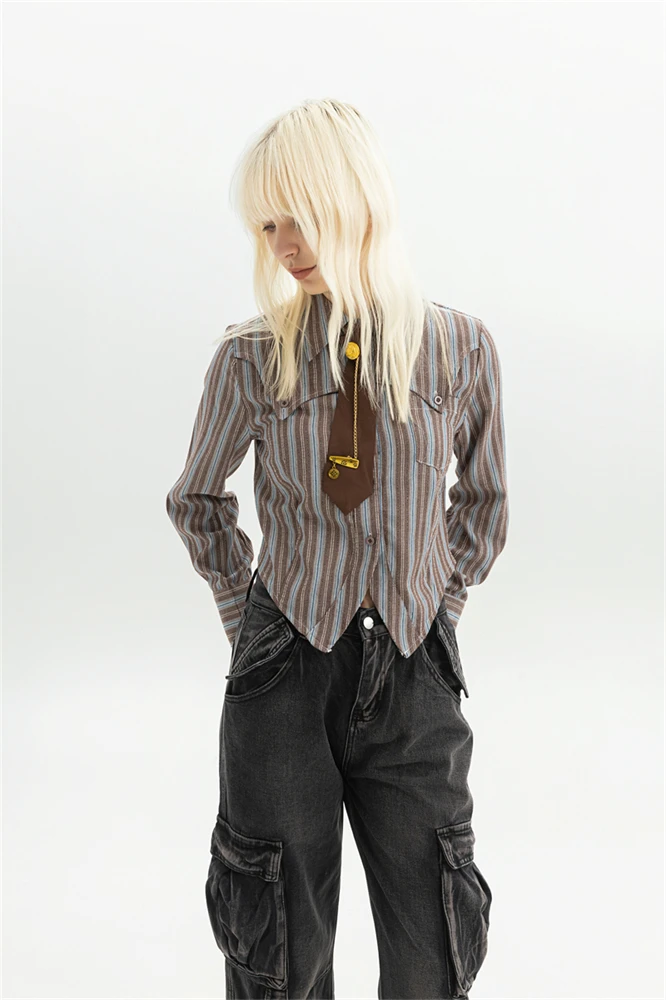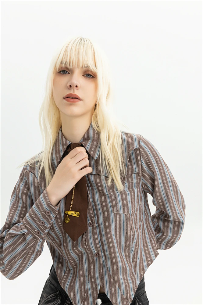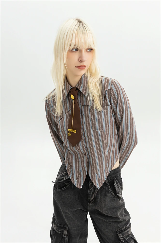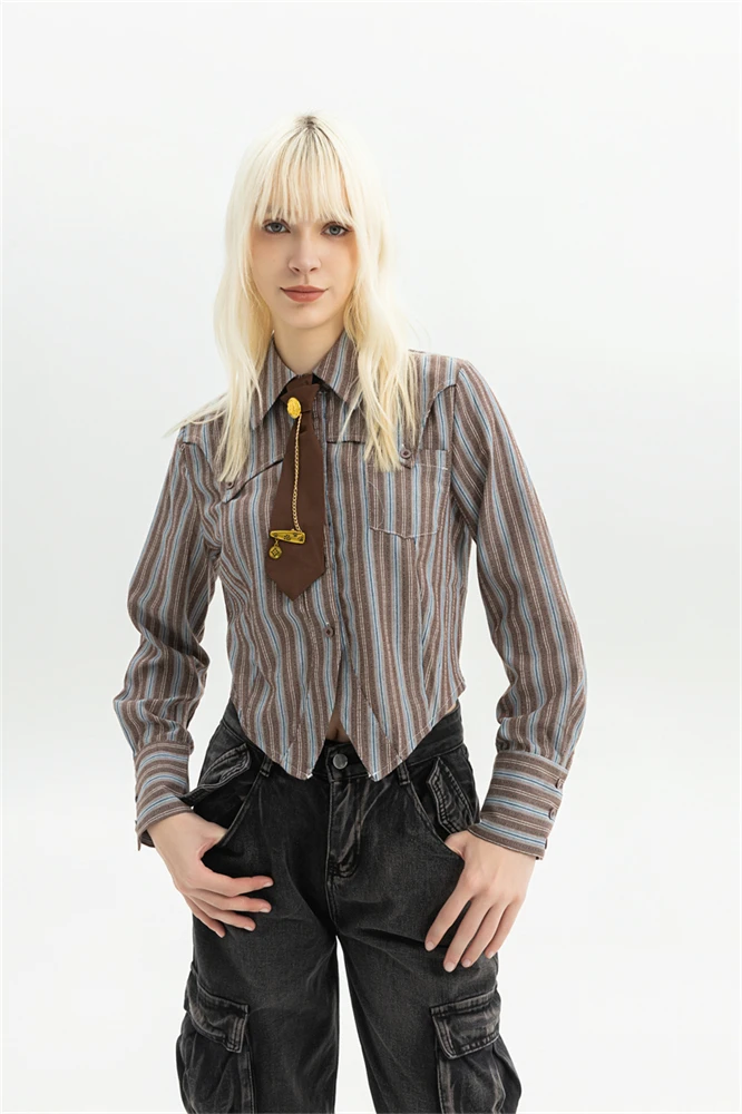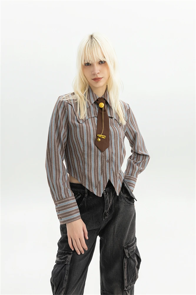 Women Striped Shirts Blouses Vintage Harajuku 90s Aesthetic Y2k 2000s Elegant Polo-Neck Long Sleeve Shirts 2000s Clothes Autumn