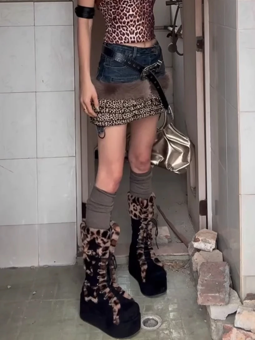 Women's A-line Leopard Print Skirt Vintage 90s Aesthetic Y2k Cargo Skirt Harajuku Korean Jeans Skirt Emo 2000s Clothes Summer