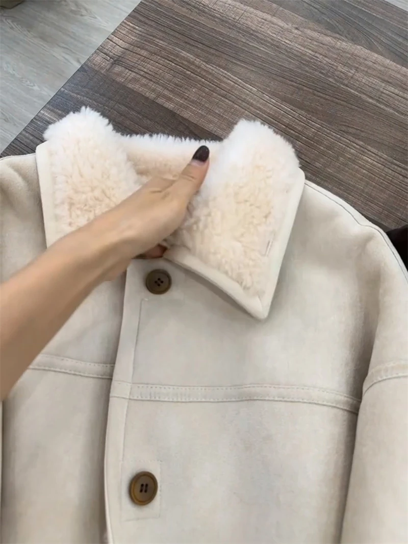 Women's Beige Leather Coat Jacket Vintage Motorcycle Shearling Jackets Y2k Mustang Coats Harajuku Outfits 2000s Winter Clothes