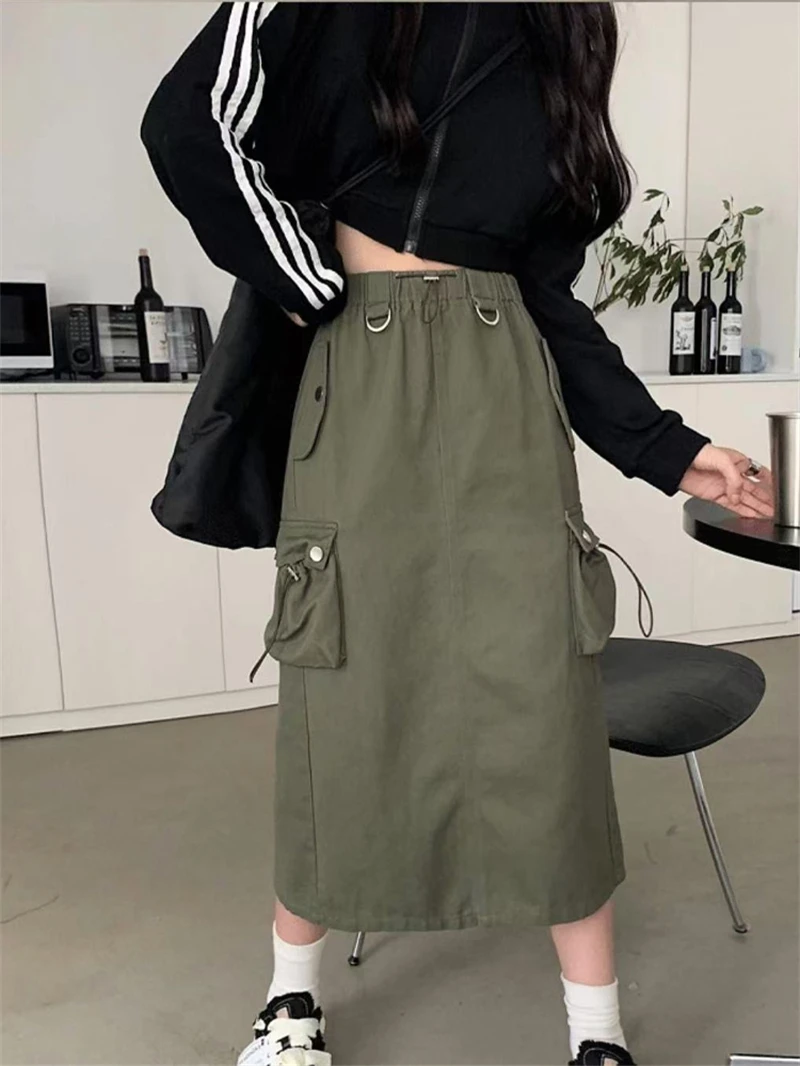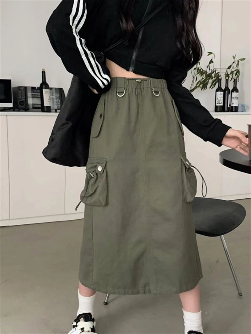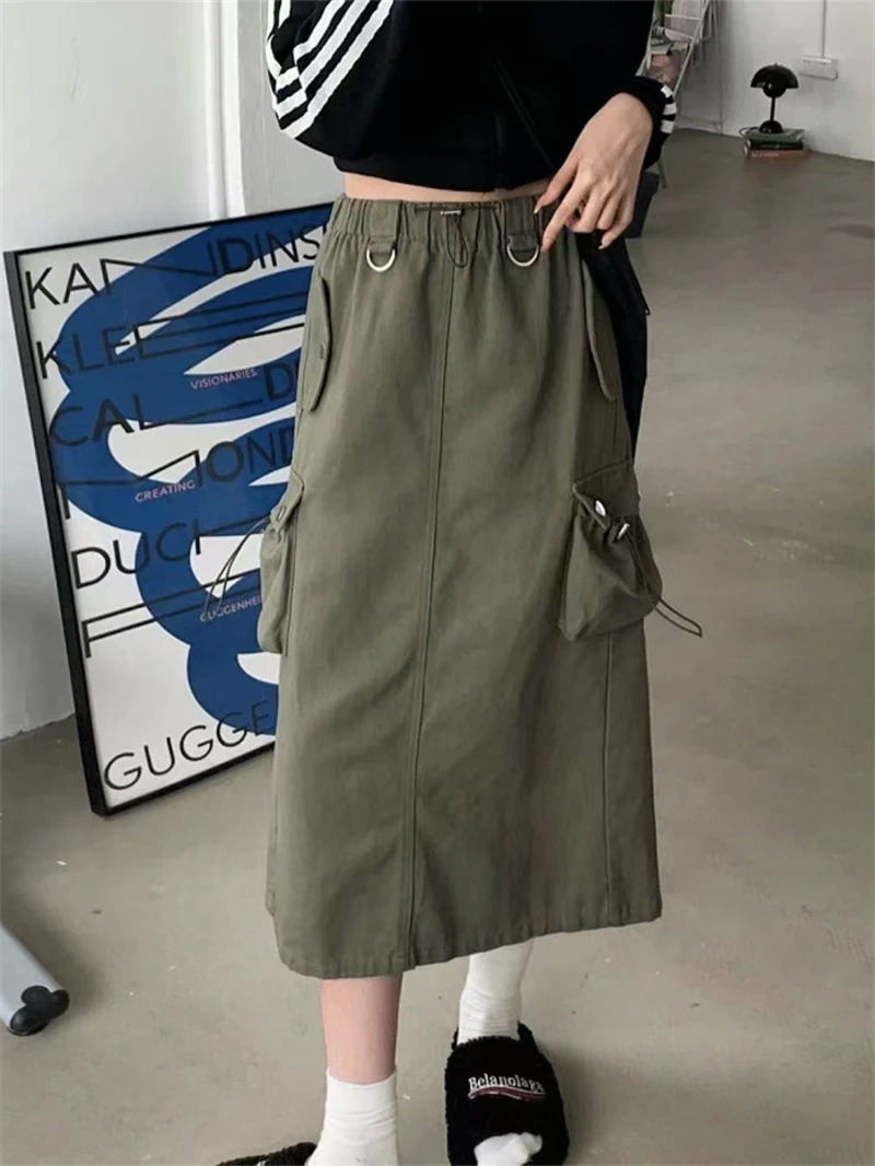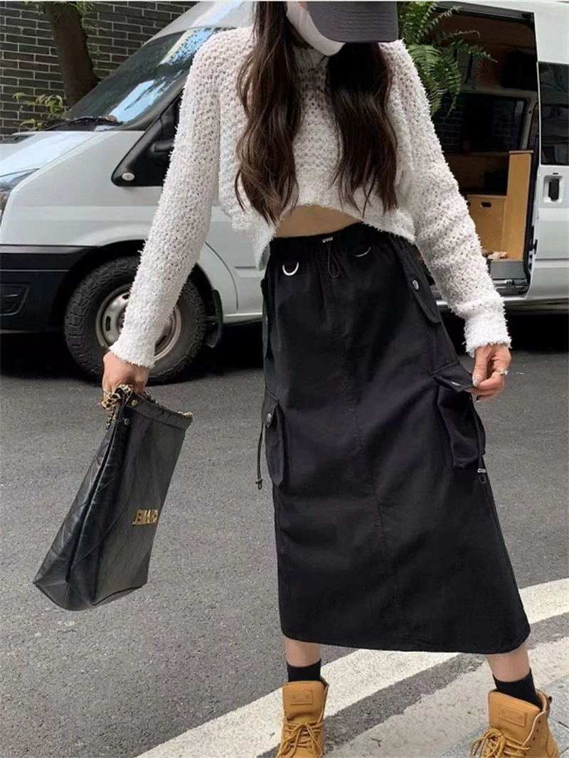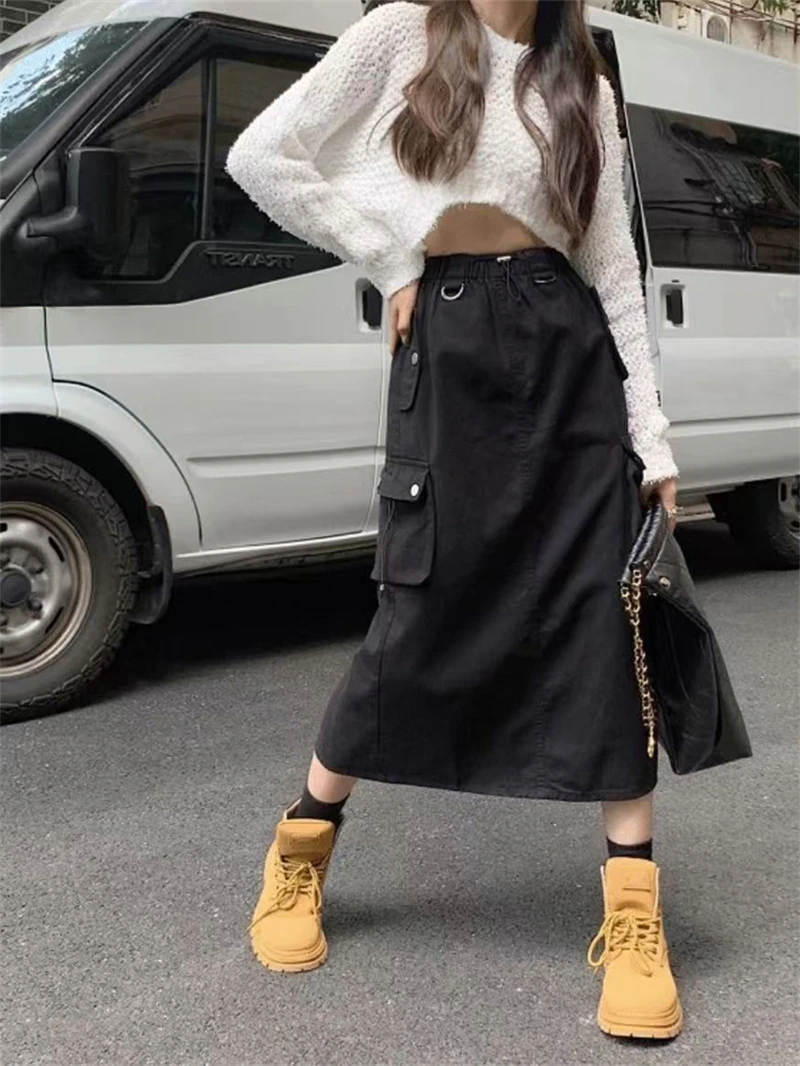 Women's Black Gothic A-line Cargo Skirt Vintage Aesthetic Streetwear Y2k Long Skirt Harajuku Korean Skirts 2000s Clothes Summer