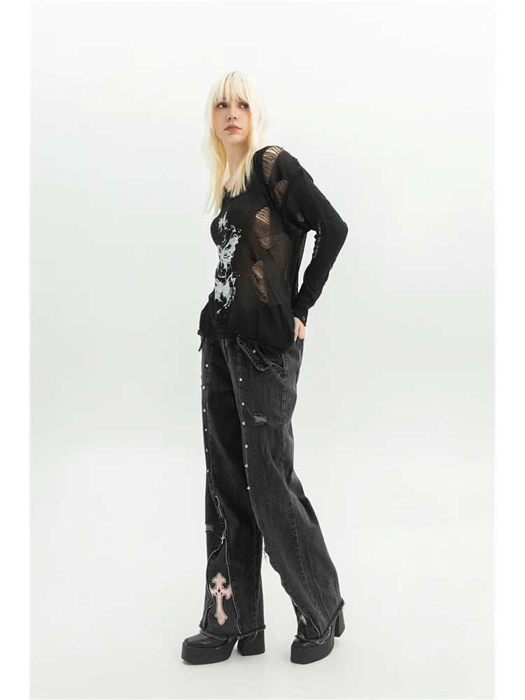 Women's Black Gothic Graffiti Print T-shirt Harajuku Korean Y2k 90s Vintage Long Sleeve Emo Torn T-shirts Clothes 2000s Summer