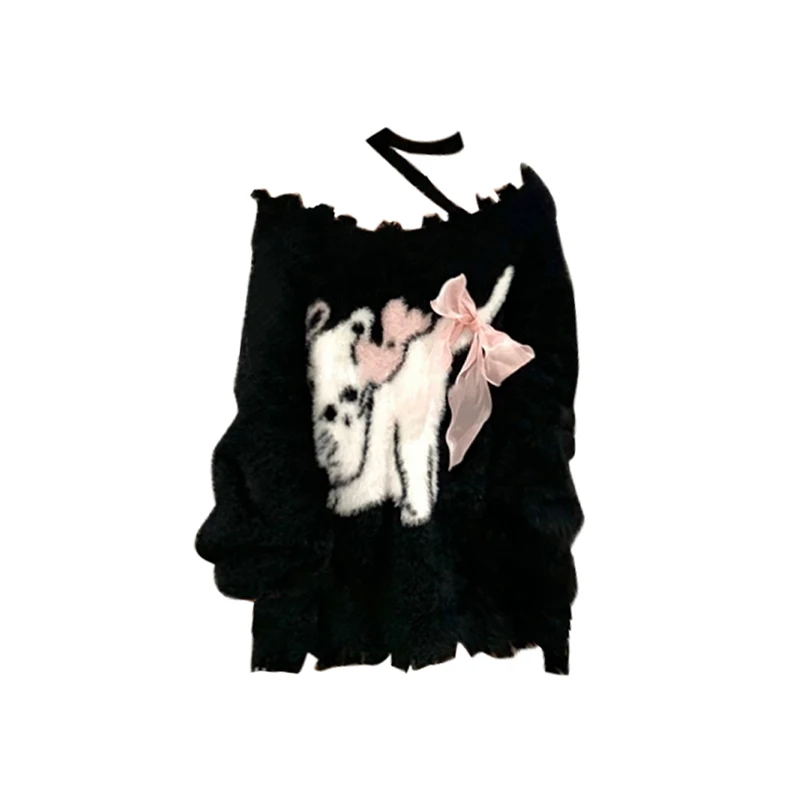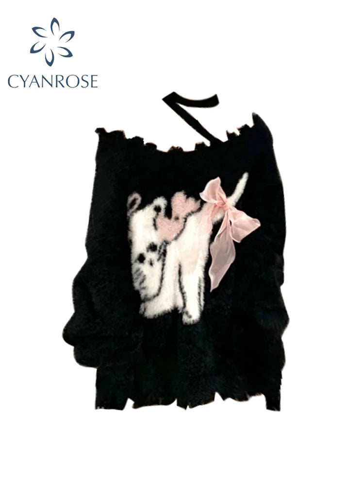 Women's Black Gothic Pullover Knitted Sweater Elegant Harajuku Y2k Long Sleeves Oversize Sweaters Jumper Vintage 2000s Clothes