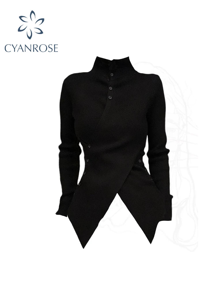 Women's Black Gothic Pullover Knitted Sweater Harajuku Korean Y2k Turtleneck Long Sleeves Jumper Sweaters Vintage 2000s Clothes