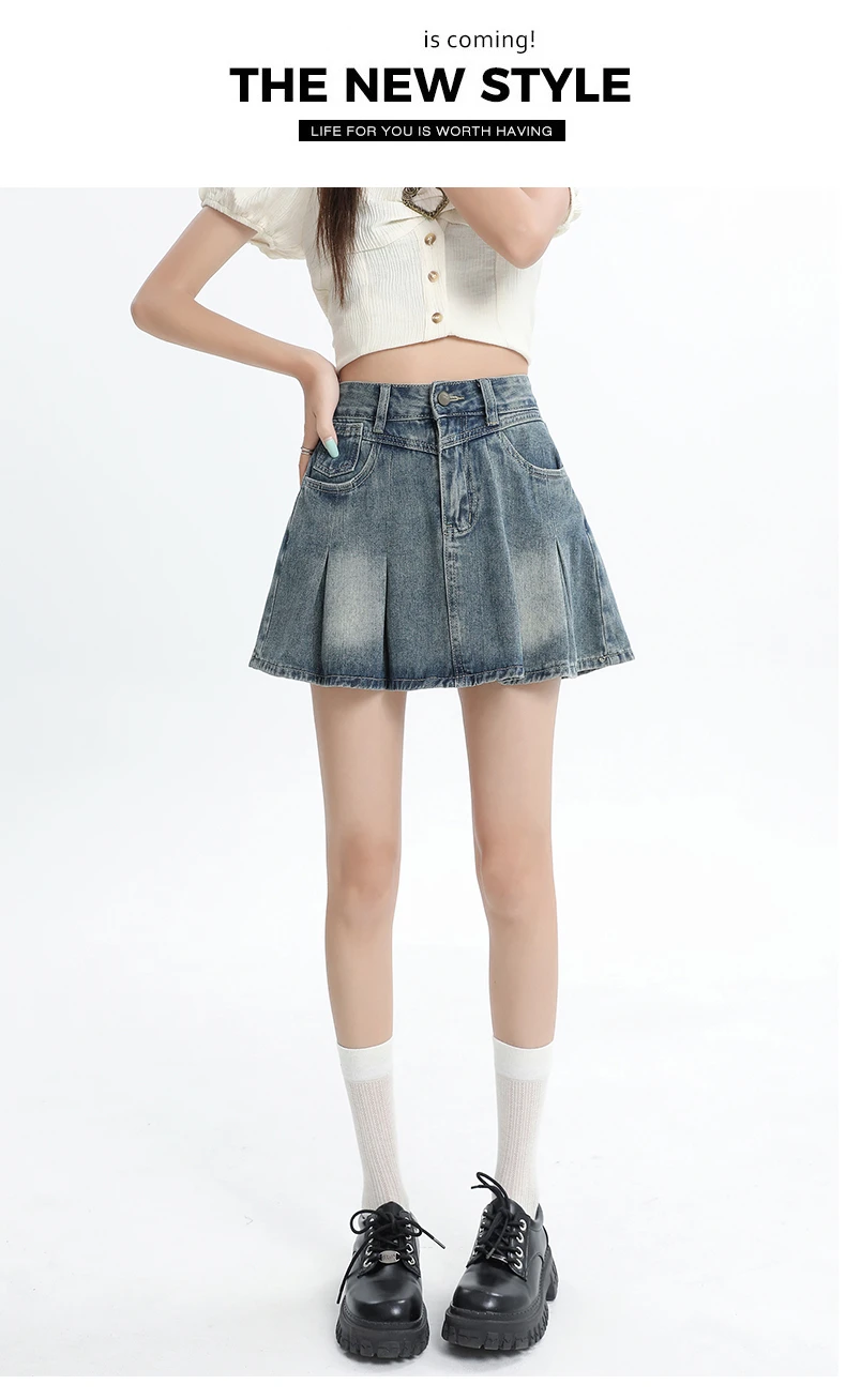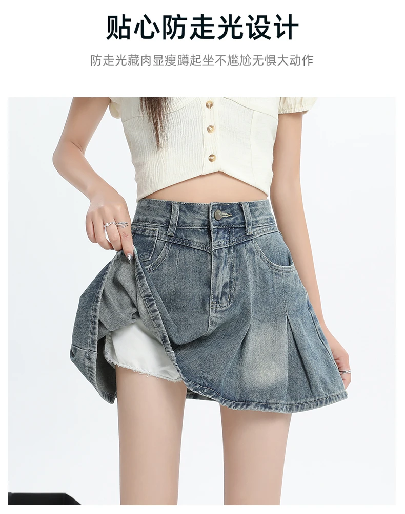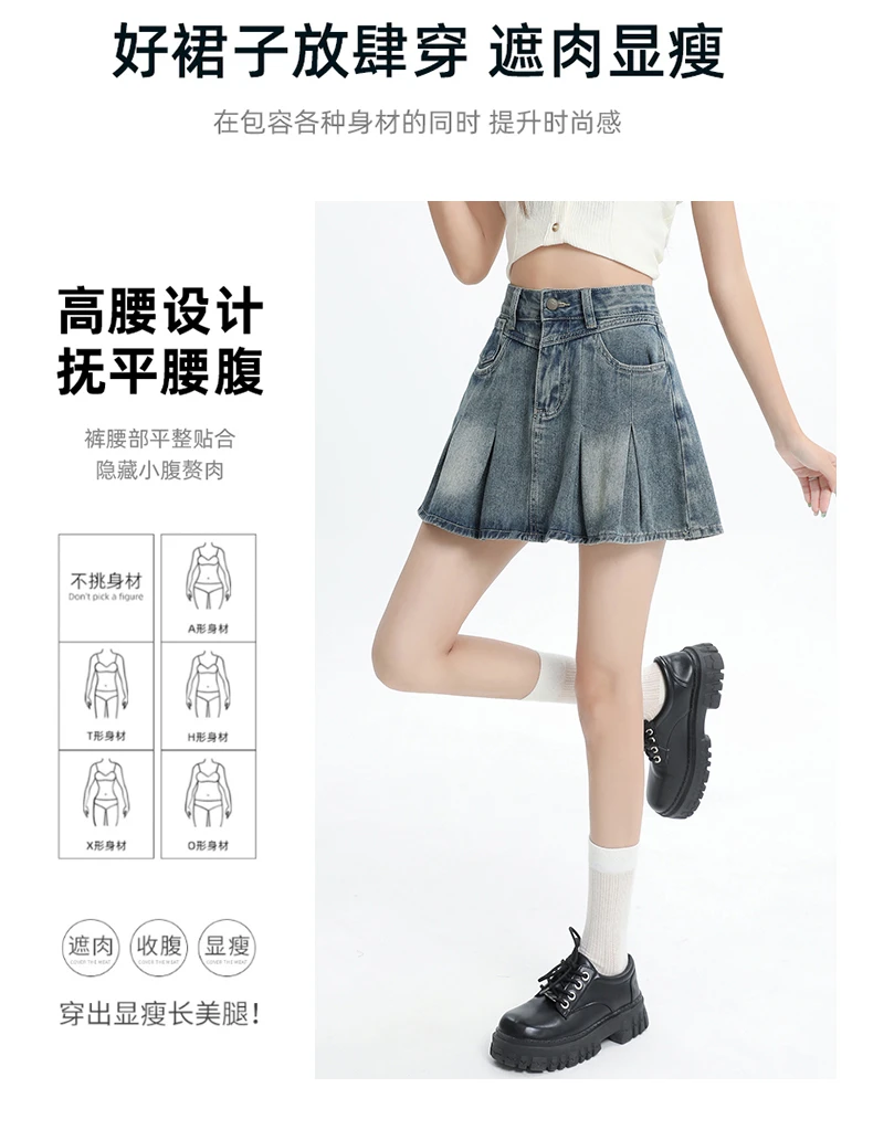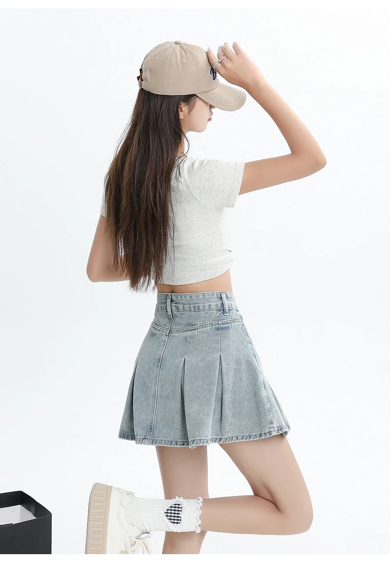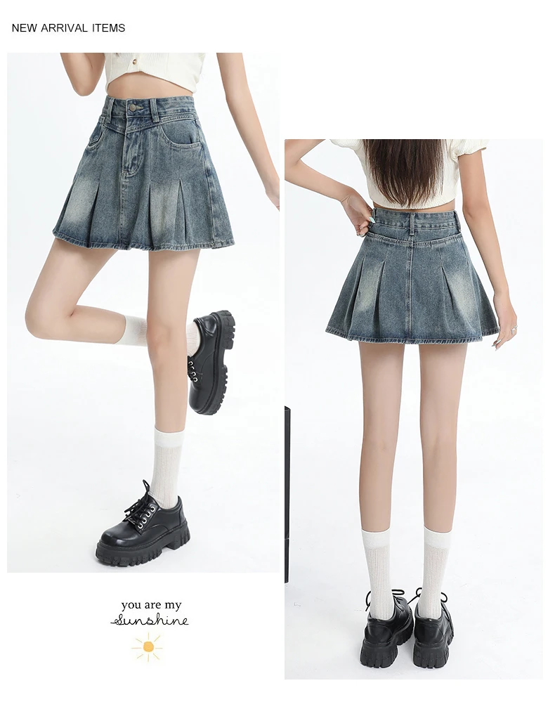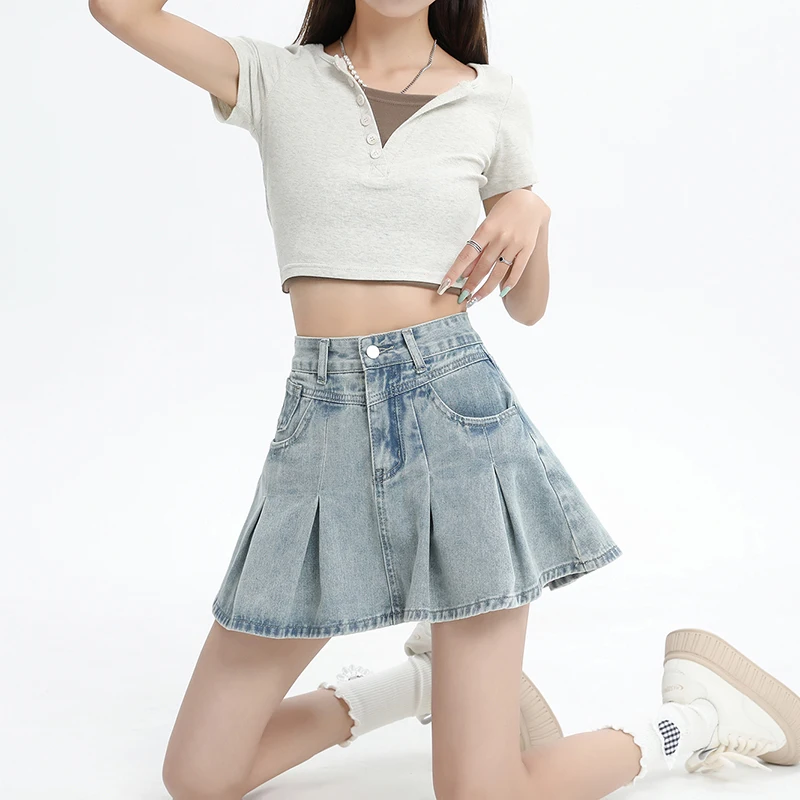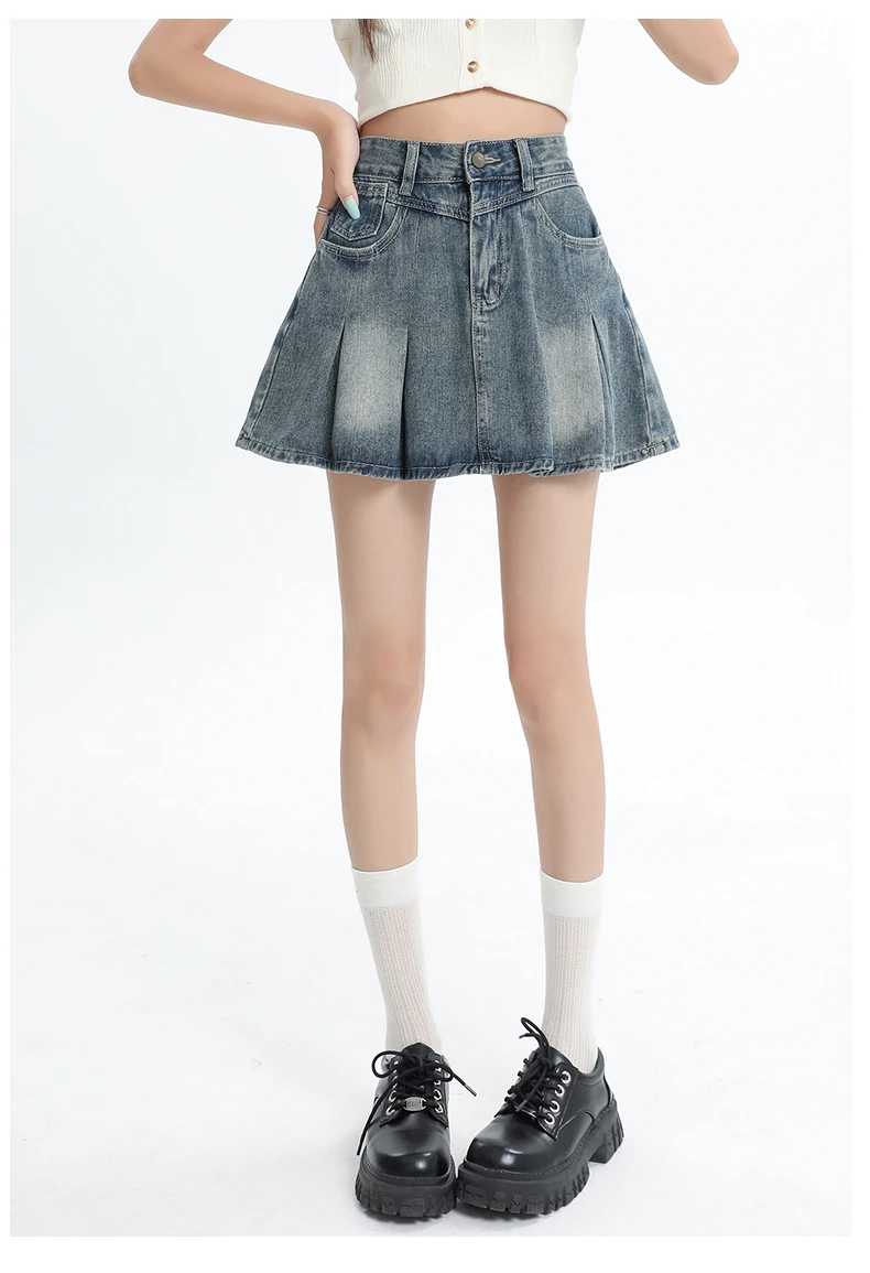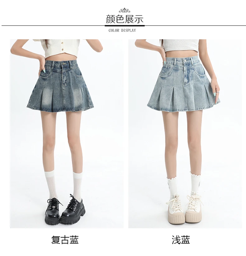 Women's Blue A-line Denim Pleated Skirt Vintage 90s Aesthetic Y2k Jean Skirt Harajuku Korean Cowboy Skirts 2000s Clothes Summer