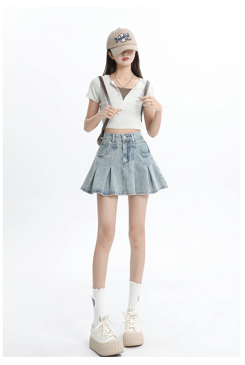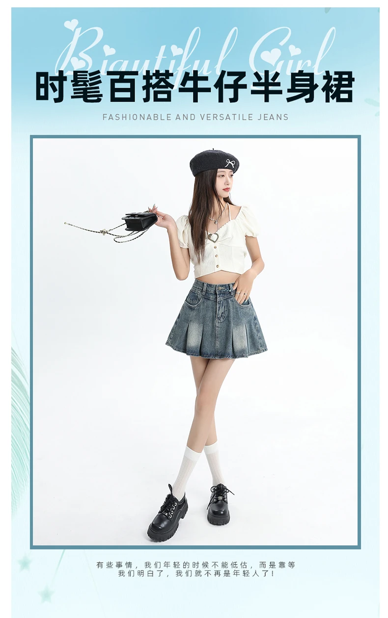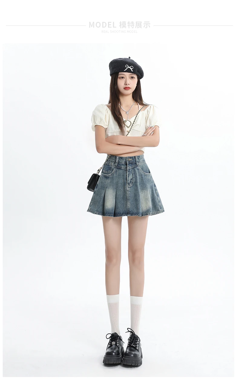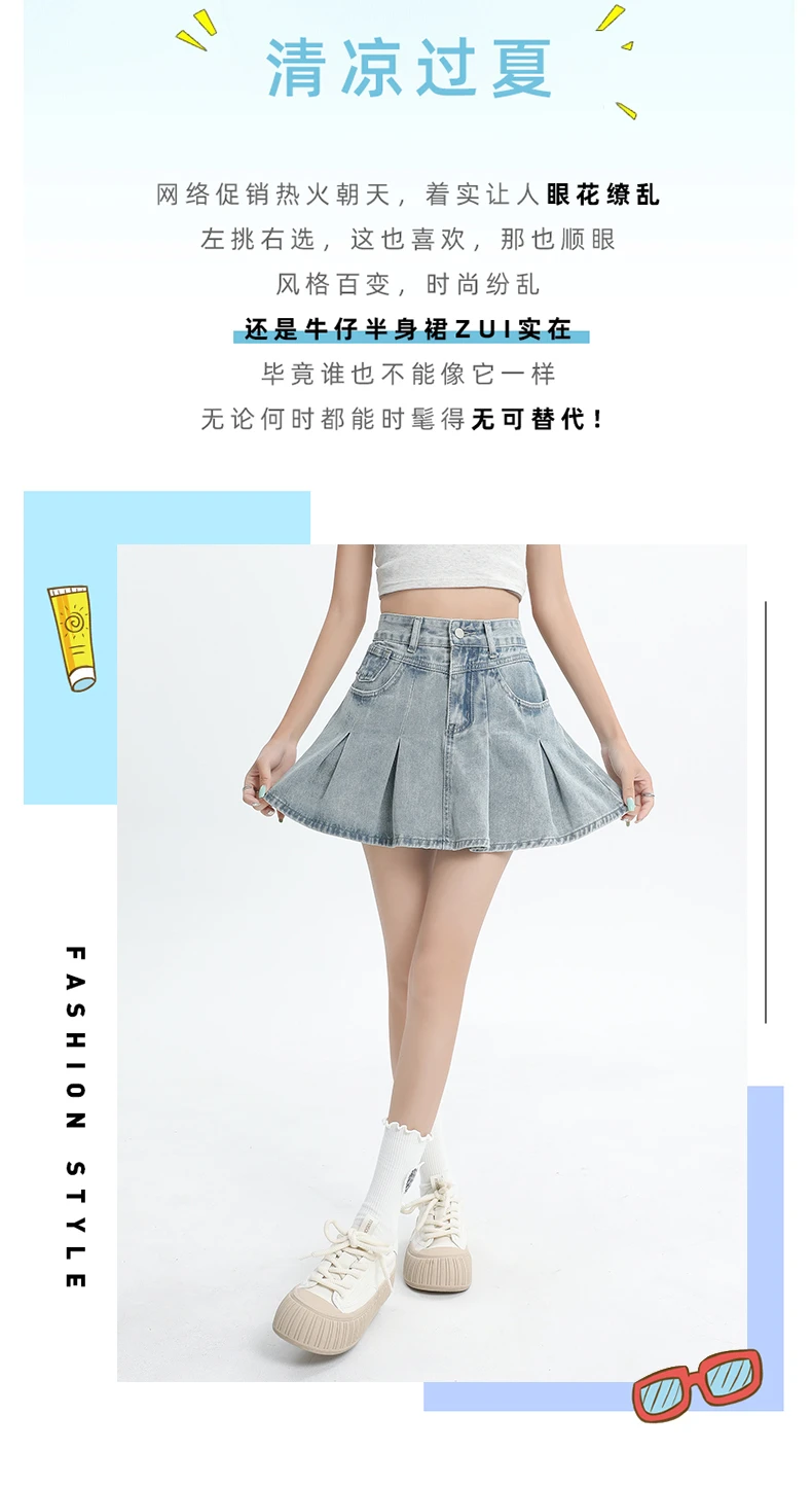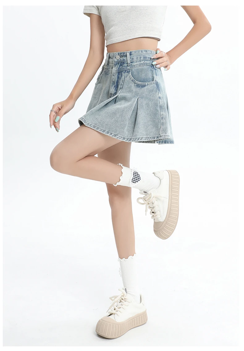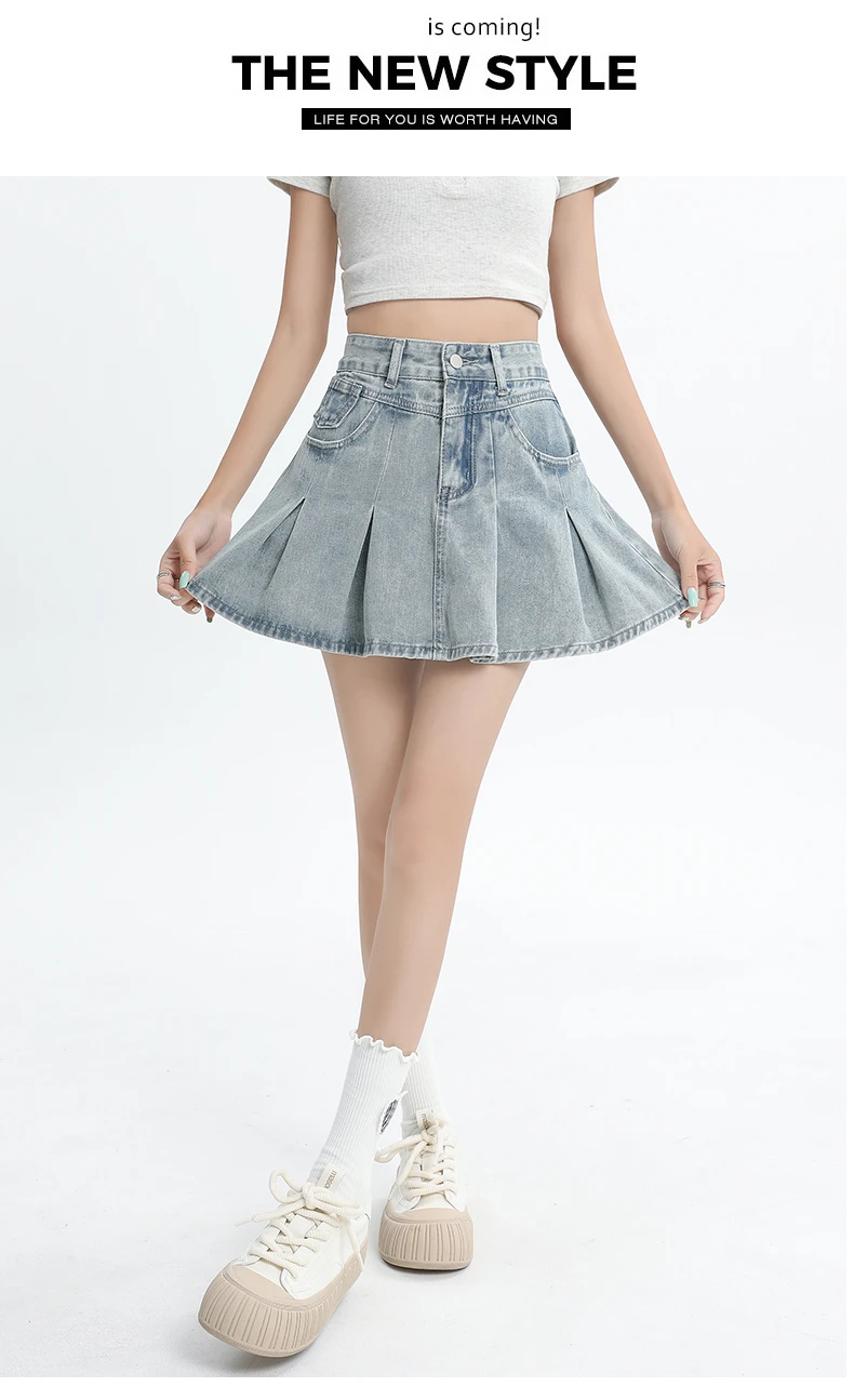 Women's Blue A-line Denim Pleated Skirt Vintage 90s Aesthetic Y2k Jean Skirt Harajuku Korean Cowboy Skirts 2000s Clothes Summer
