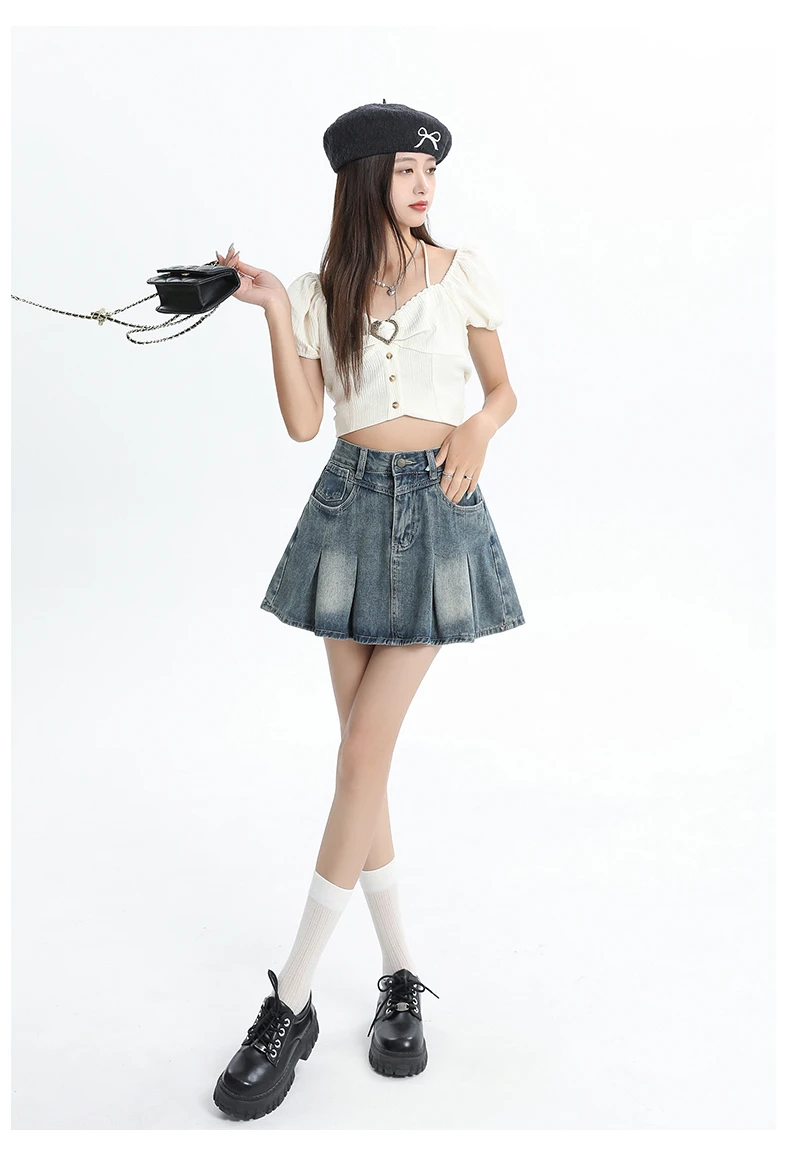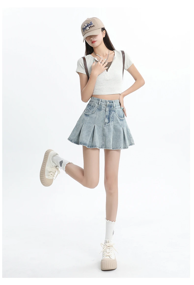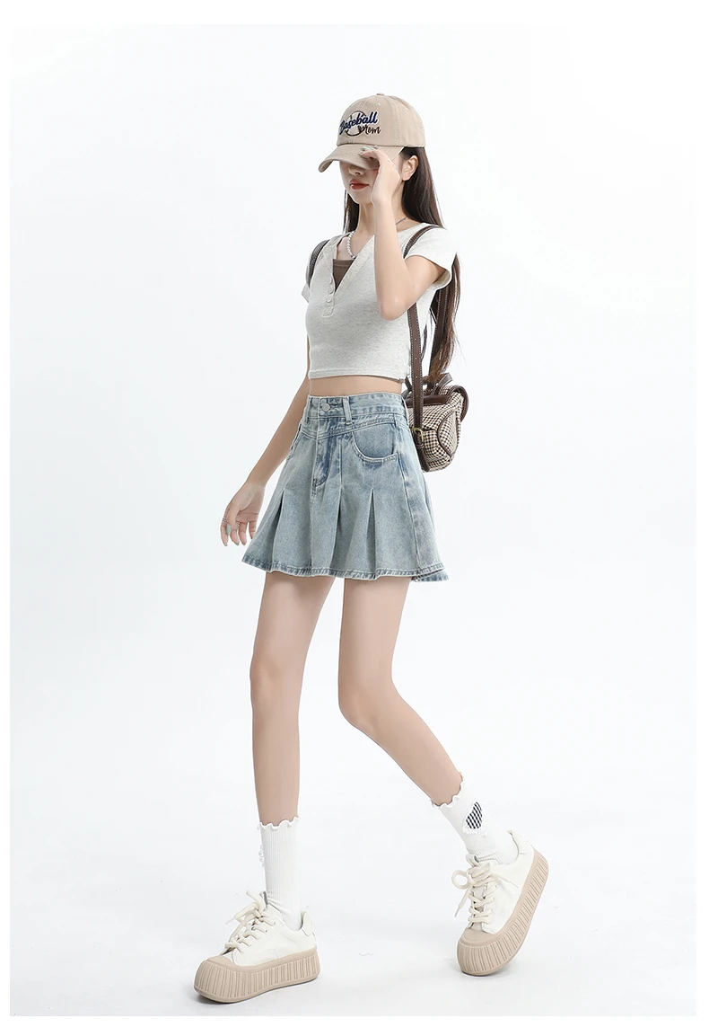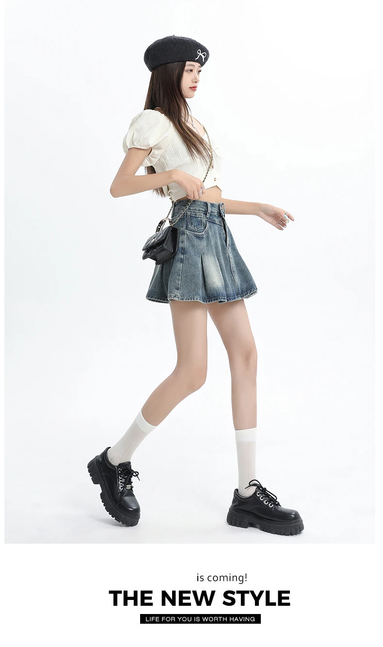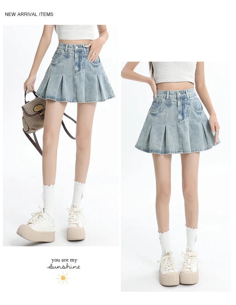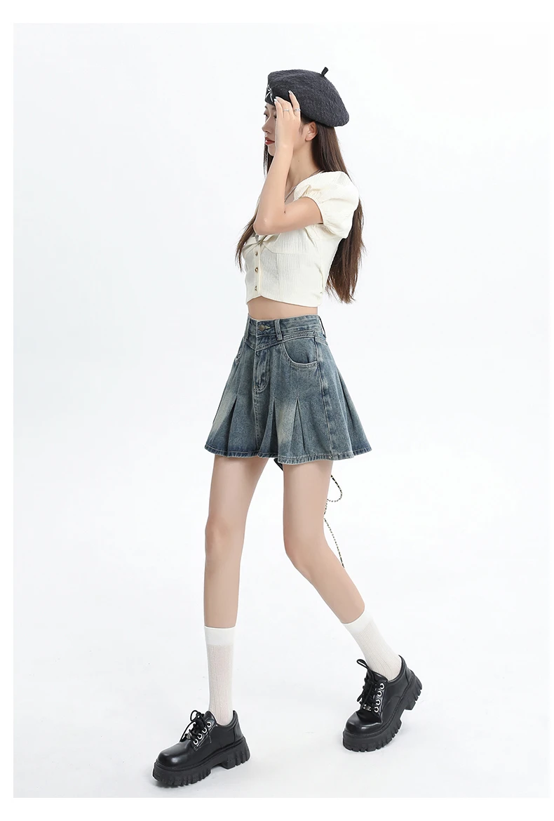 Women's Blue A-line Denim Pleated Skirt Vintage 90s Aesthetic Y2k Jean Skirt Harajuku Korean Cowboy Skirts 2000s Clothes Summer