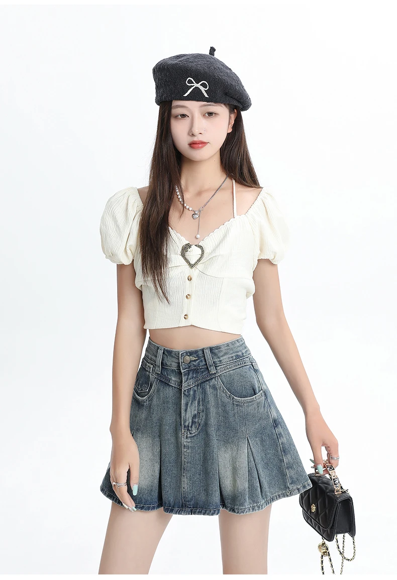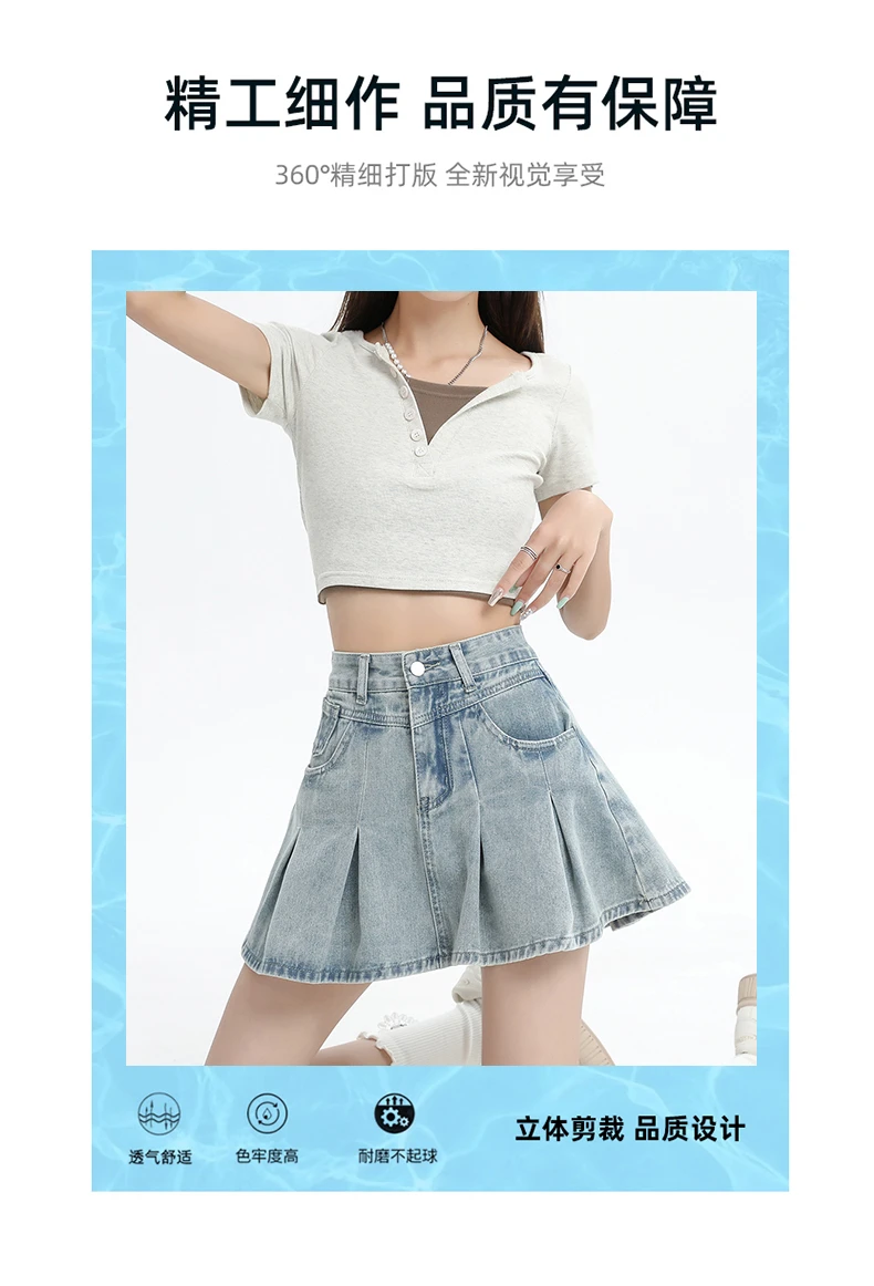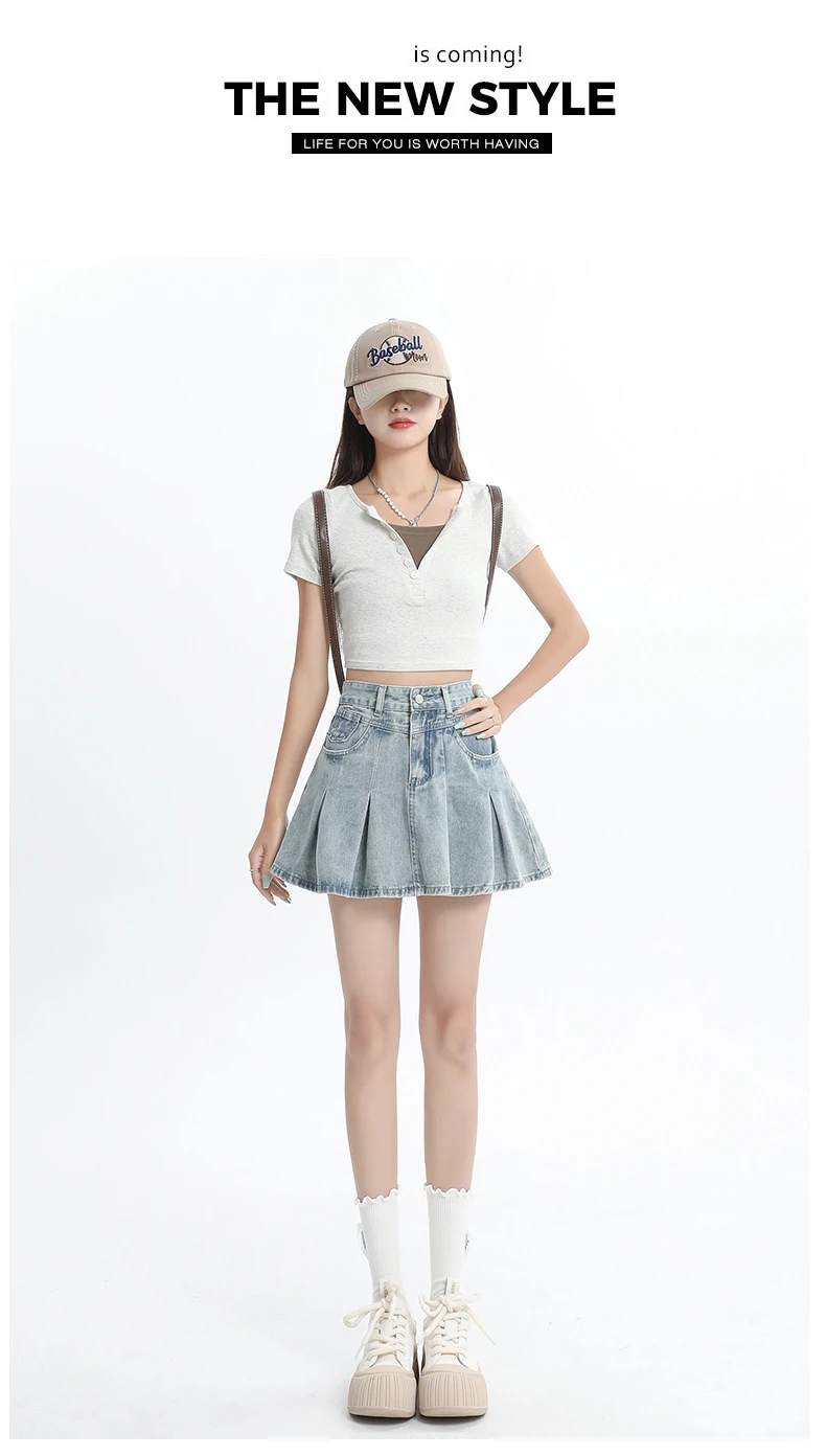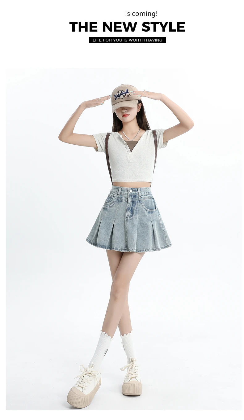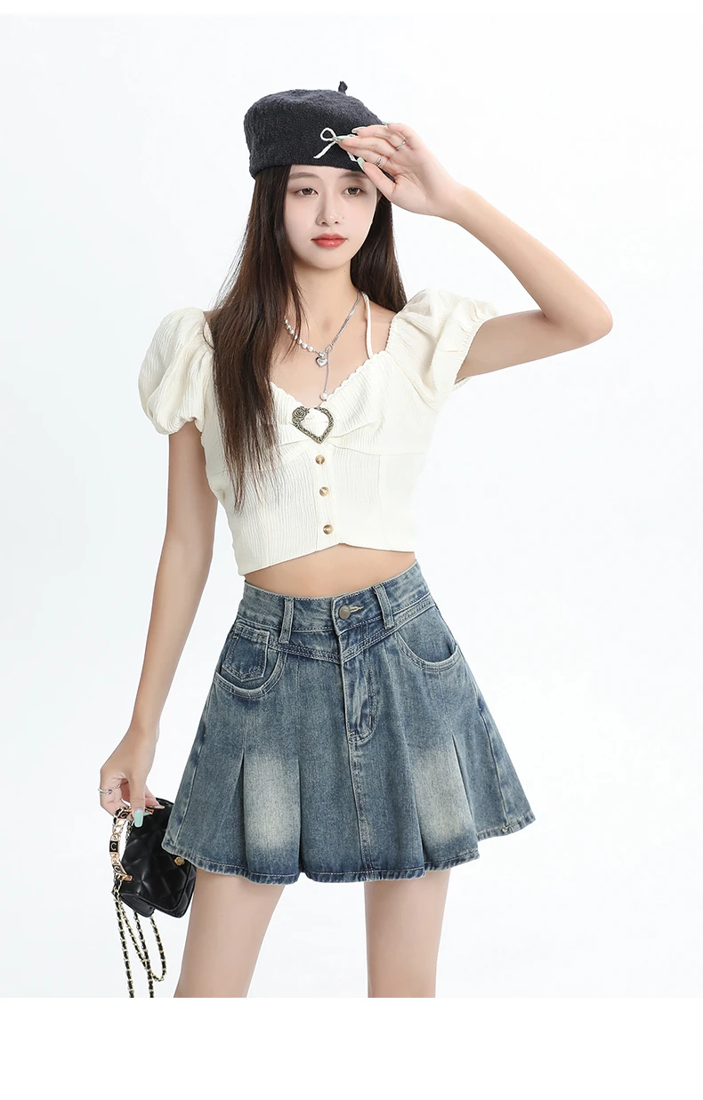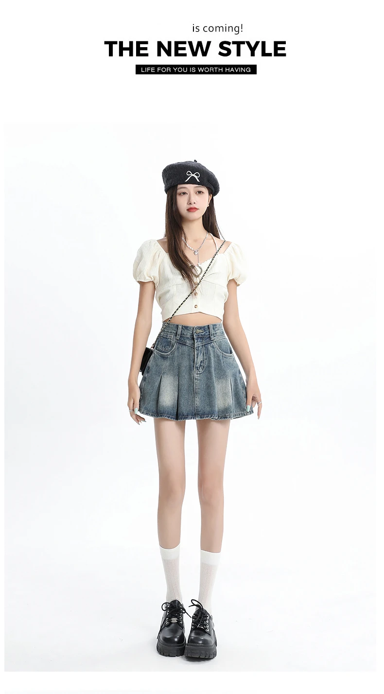 Women's Blue A-line Denim Pleated Skirt Vintage 90s Aesthetic Y2k Jean Skirt Harajuku Korean Cowboy Skirts 2000s Clothes Summer