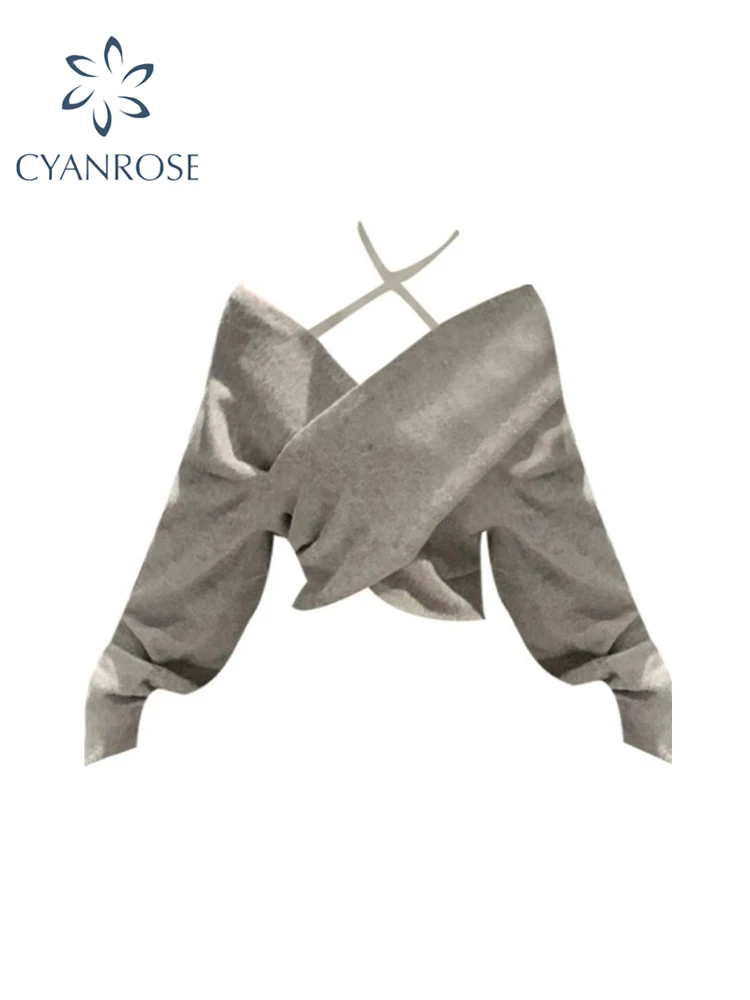 Women's Grey Pullover Knitted Sweater Harajuku Y2k Long Sleeve V-Neck Sweater Jumper Vintage 2000s Aesthetic Clothes Autumn 2024