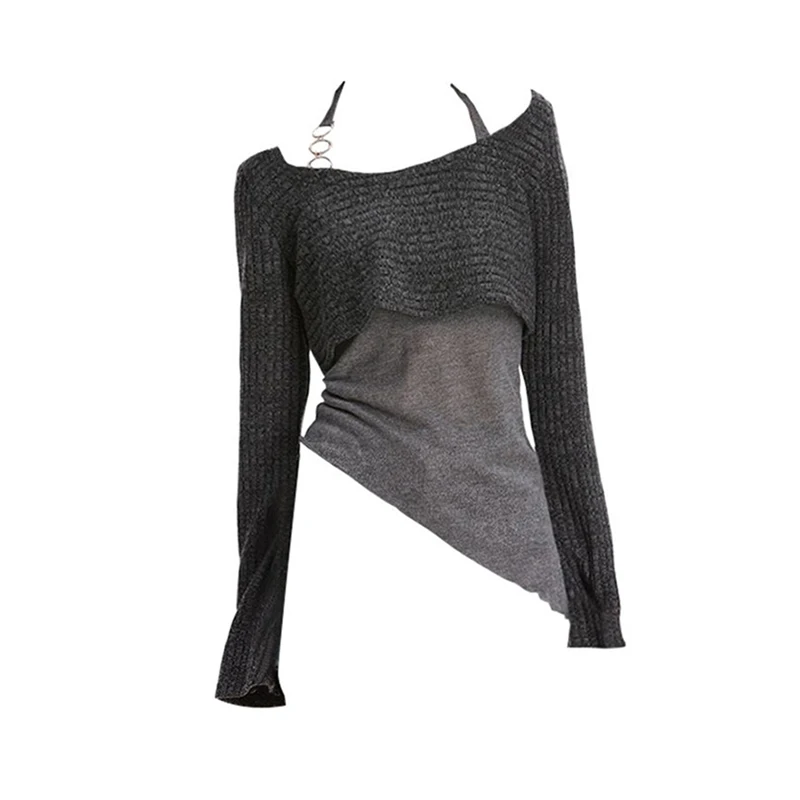 Women's Grey Pullover Knitted Sweater Vintage Harajuku 2000s Fashion Elegant Casual Long Sleeve Sweater Top 90s Clothes Autumn