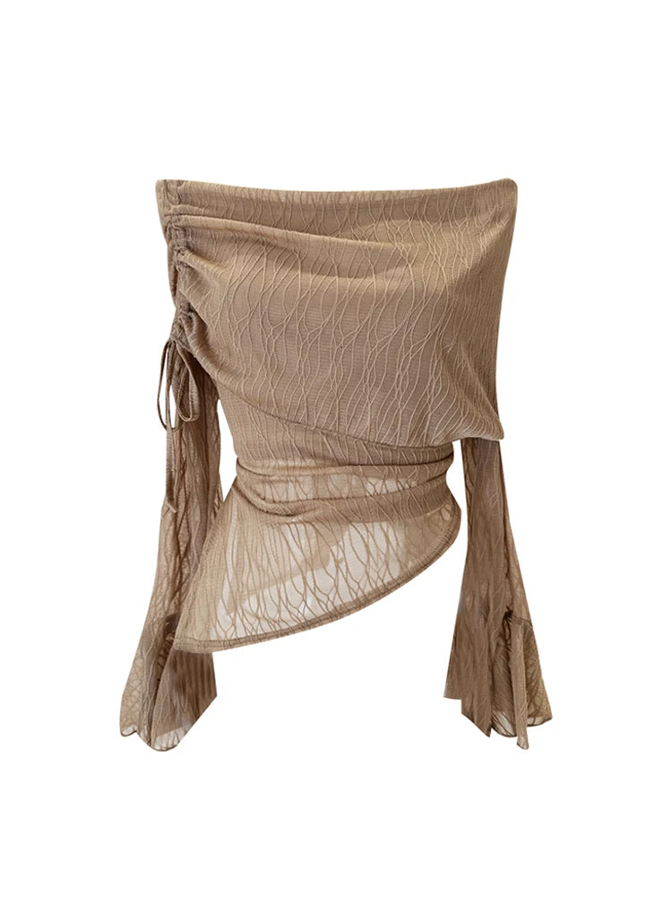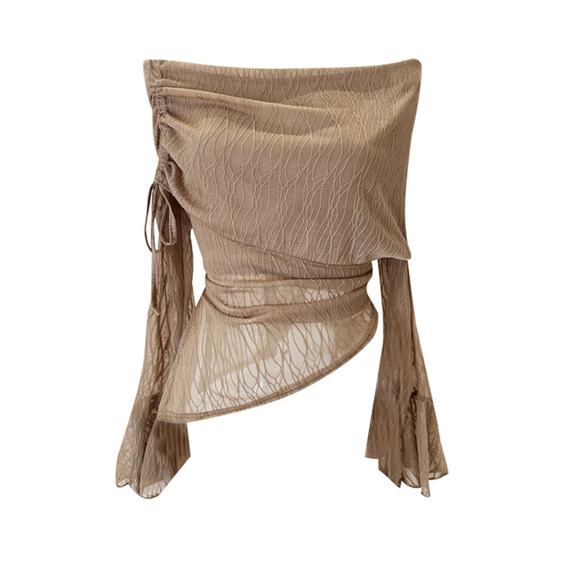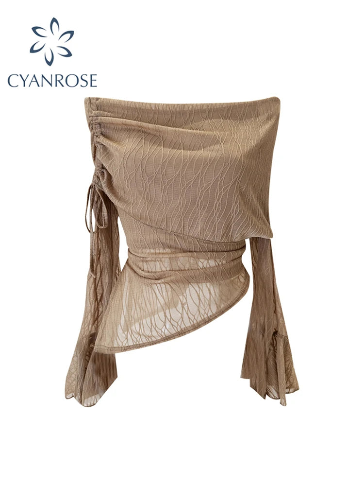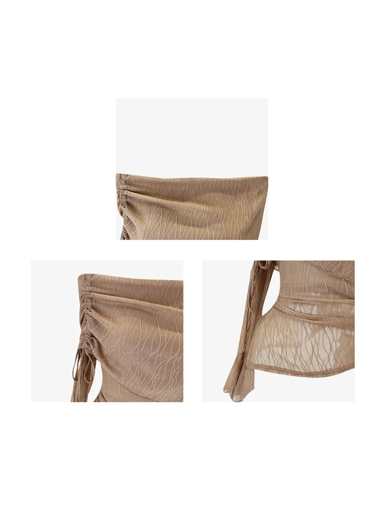 Women's Khaki Slash Neck T-shirt Harajuku Korean Y2k Tee Top 2000s Clothes Aesthetic Fashion Long Sleeve Vintage T-shirts Autumn