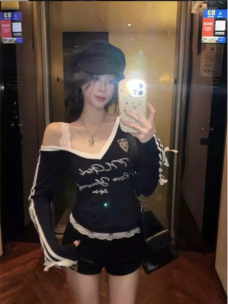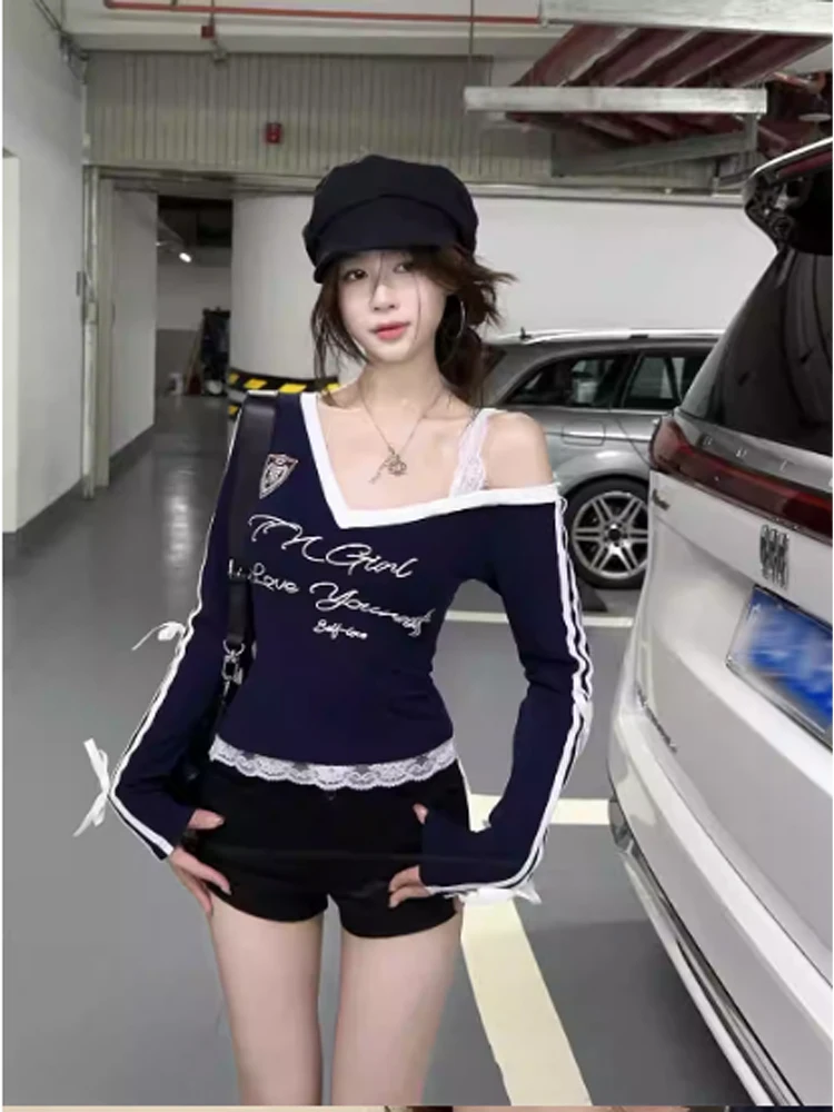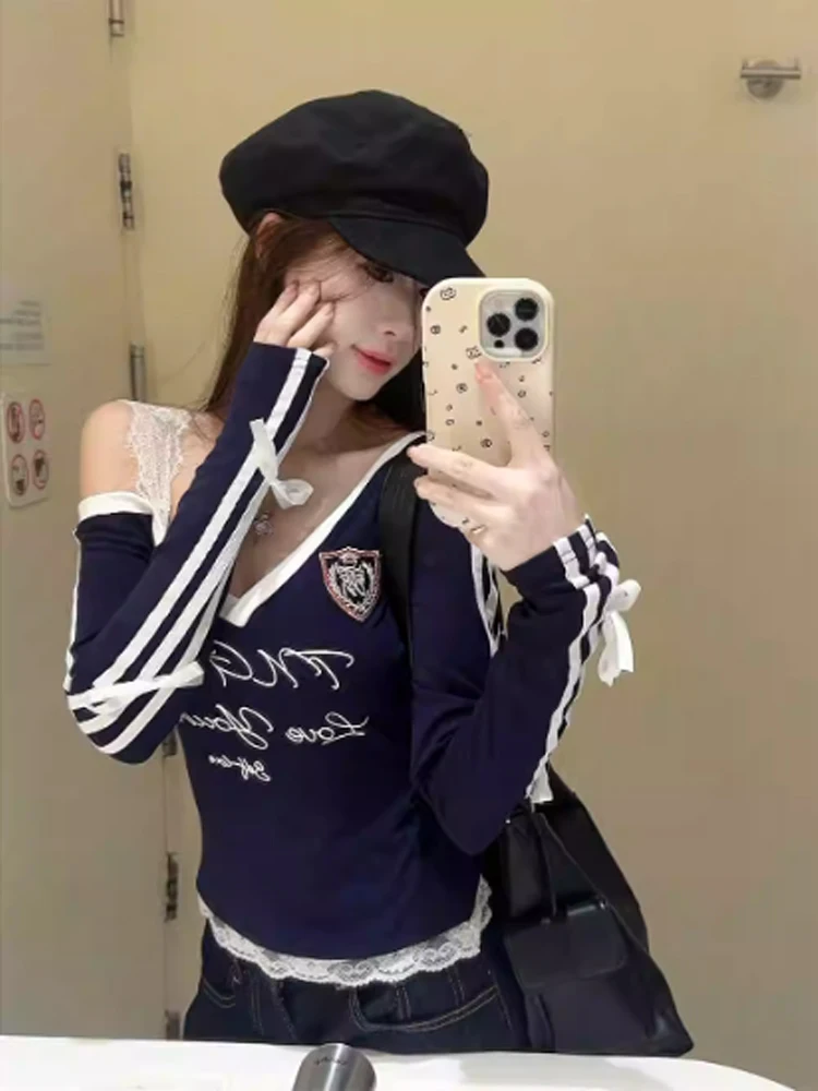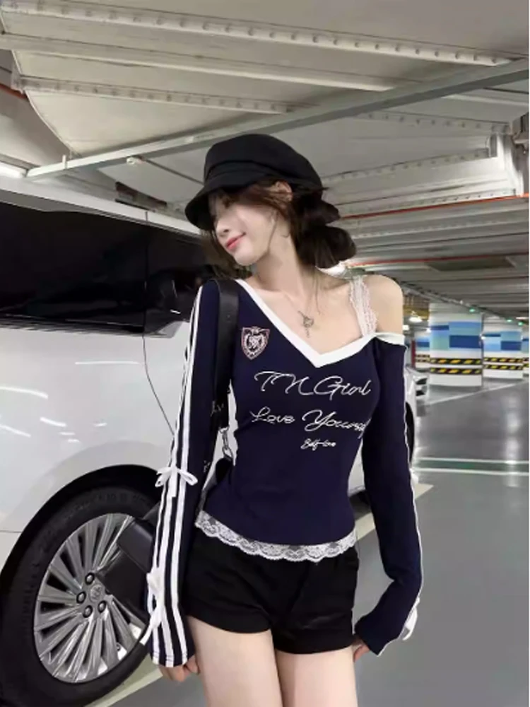Women's Navy Lace T-shirt Harajuku Korean Y2k Tee Top Vintage 90s Off Shoulder Long Sleeve Letter Print T-shirts 2000s Clothes