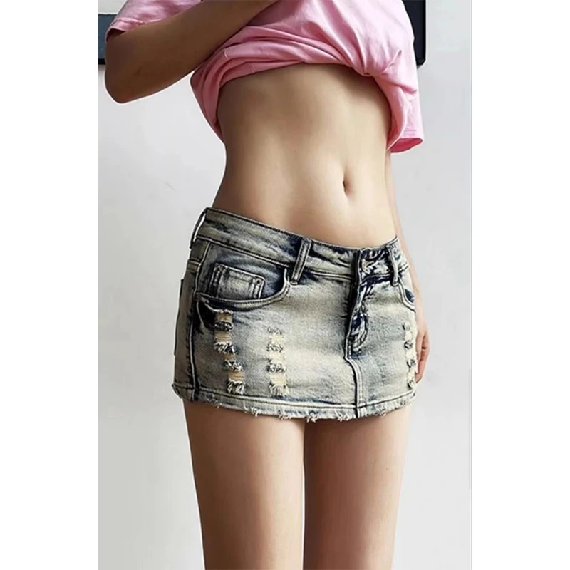 Women's Ripped A-Line Denim Skirts Y2k Harajuku Korean Cowboy Skirts Vintage 90s High Waist Jean Mini Skirt 2000s Trashy Clothes
