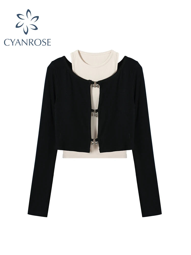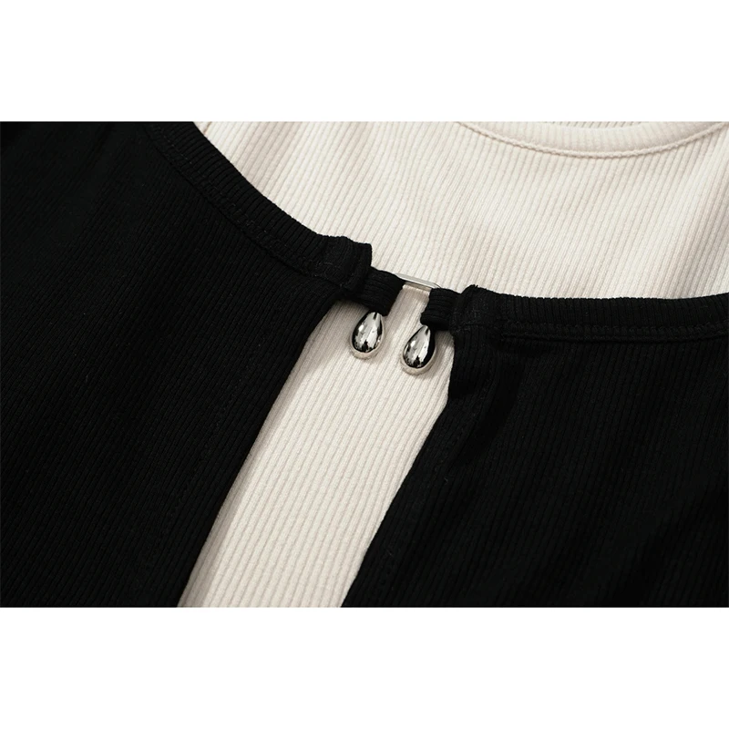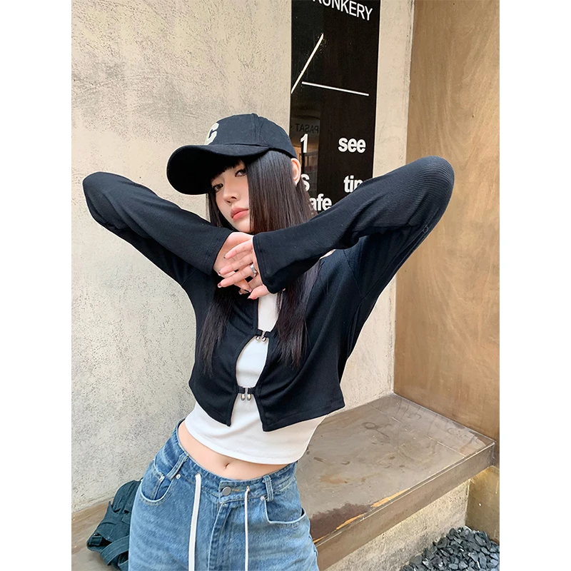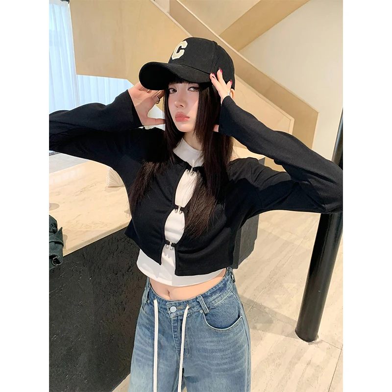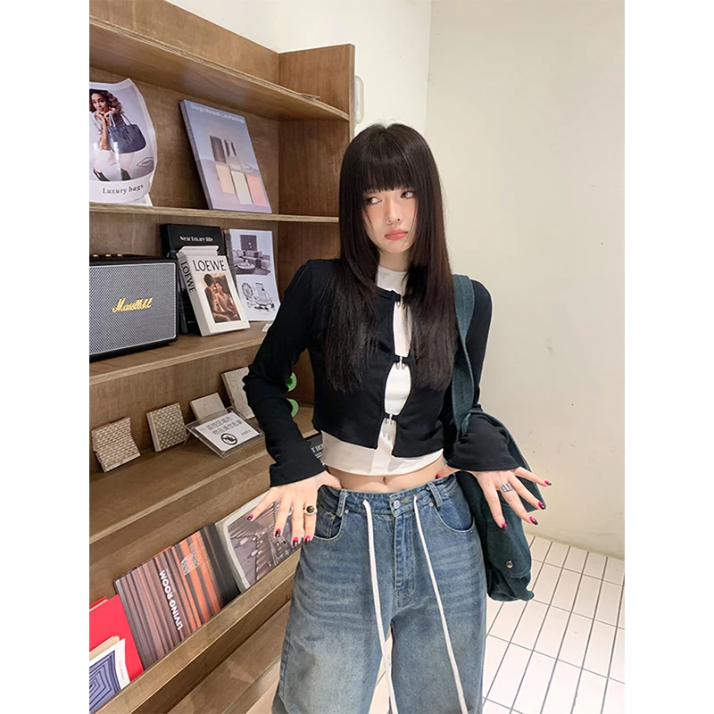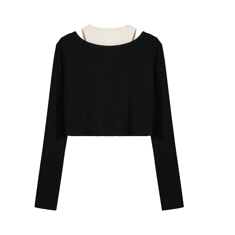 Women's T-shirt Harajuku Patchwork Crop Tops Retro Korean Y2k Black Clothes Vintage Streetwear 2023 Summer Long Sleeve Tee Top